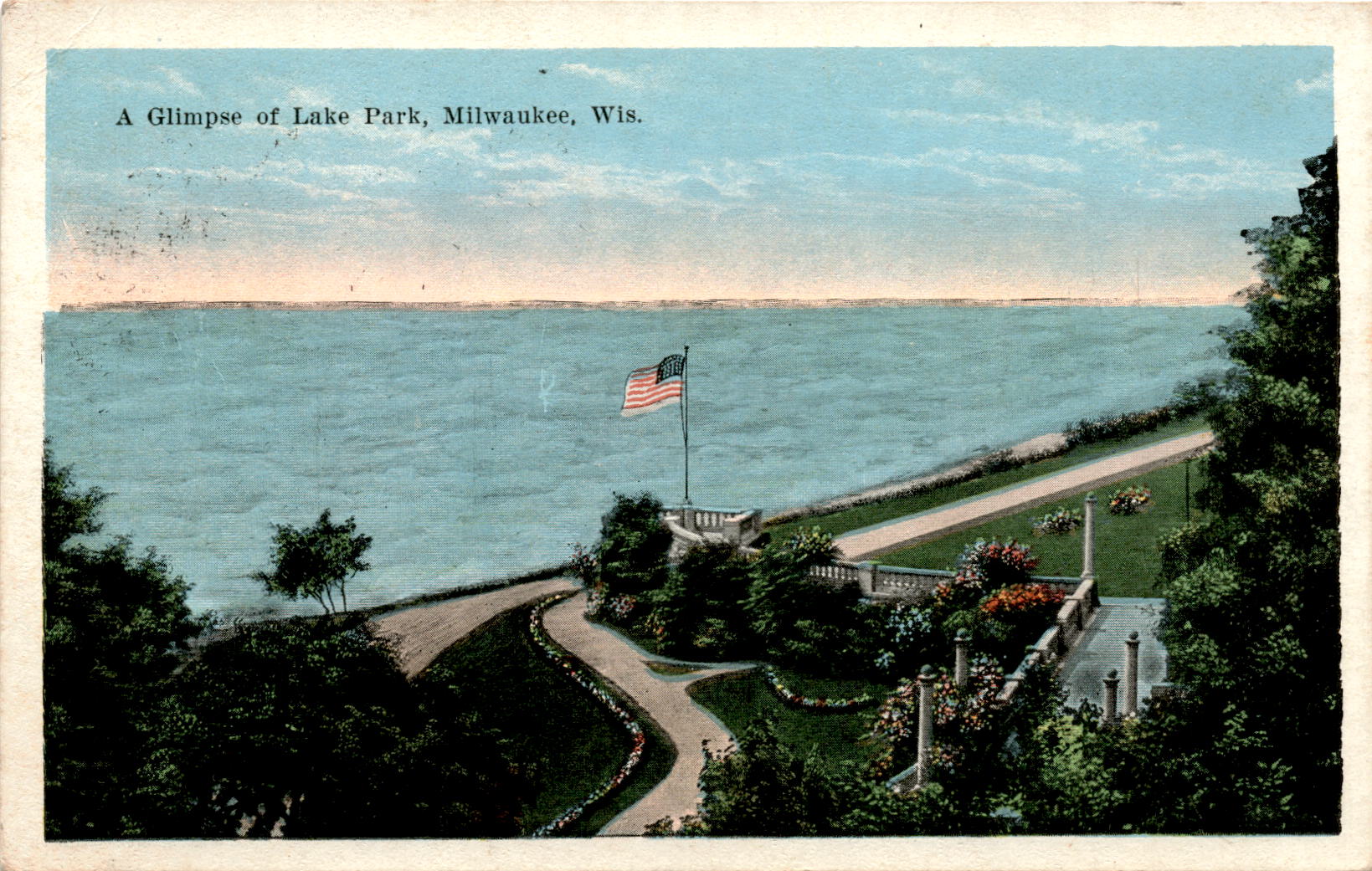 The postcard showcases a glimpse of Lake Park in Milwaukee, Wisconsin. Lake Park is a 126-acre park overlooking Lake Michigan and offering a beautiful view of Milwaukee Bay.