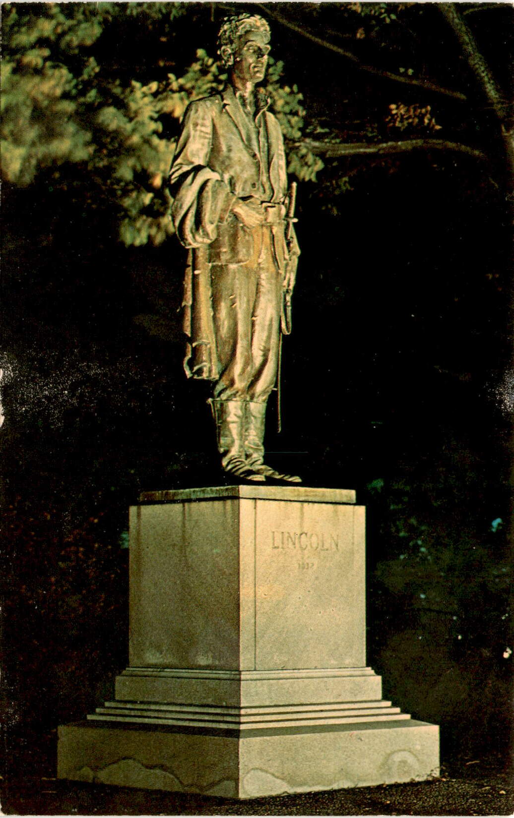 The postcard features a statue of Abraham Lincoln located in Dixon, Illinois, where he was stationed during the Black Hawk War in 1832 as Captain of Volunteers. The statue was erected by the State of Illinois in 1930 at the site of the blockhouse known as Fort Dixon. This historical site is situated between two bridges that cross the Rock River.