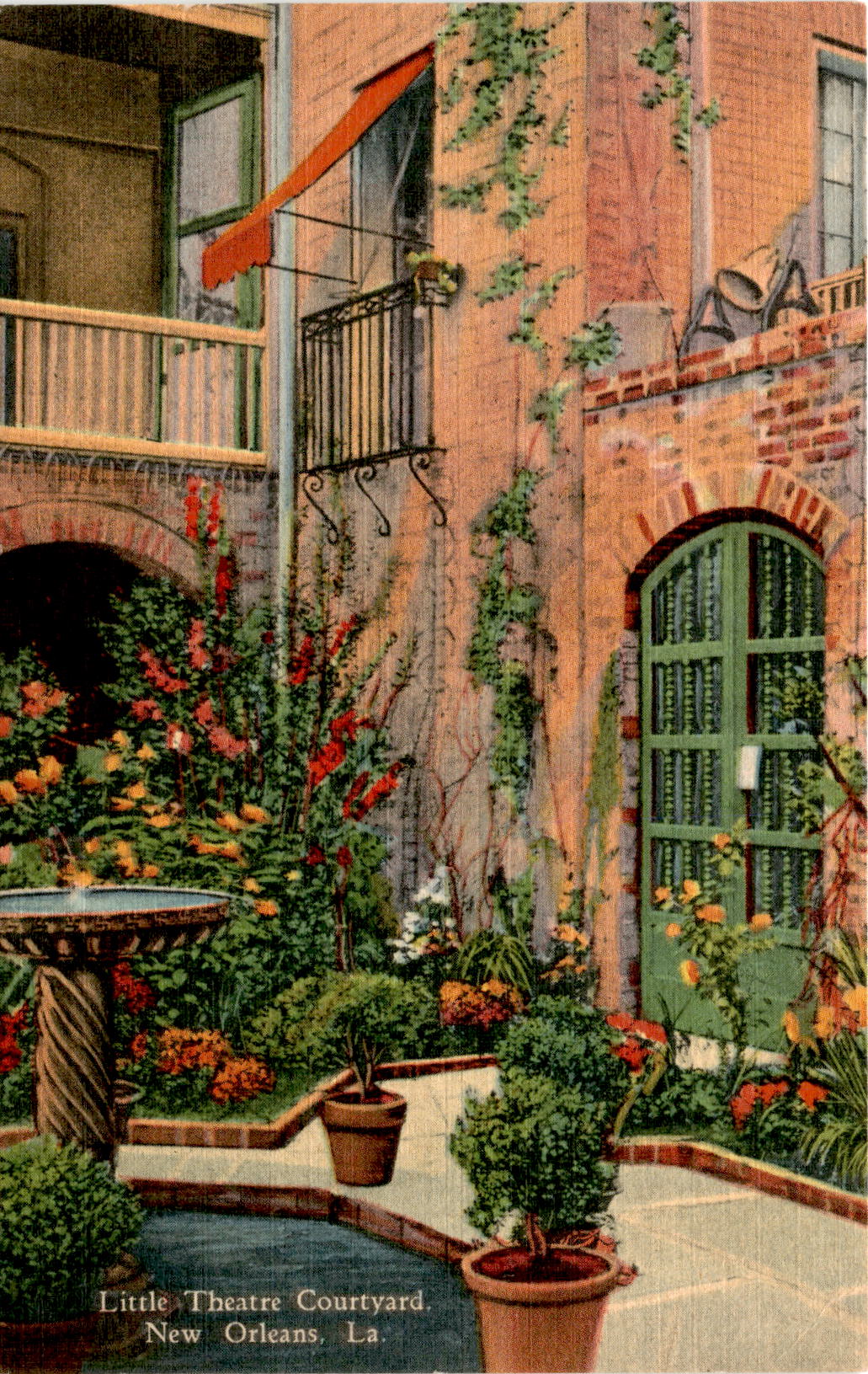 The postcard features an image of the courtyard of Le Petit Theatre du Vieux Carre in New Orleans, Louisiana, known as the Little Theatre. The theater is located at 616 St. Peter Street and has a membership of around 2000 subscribers.