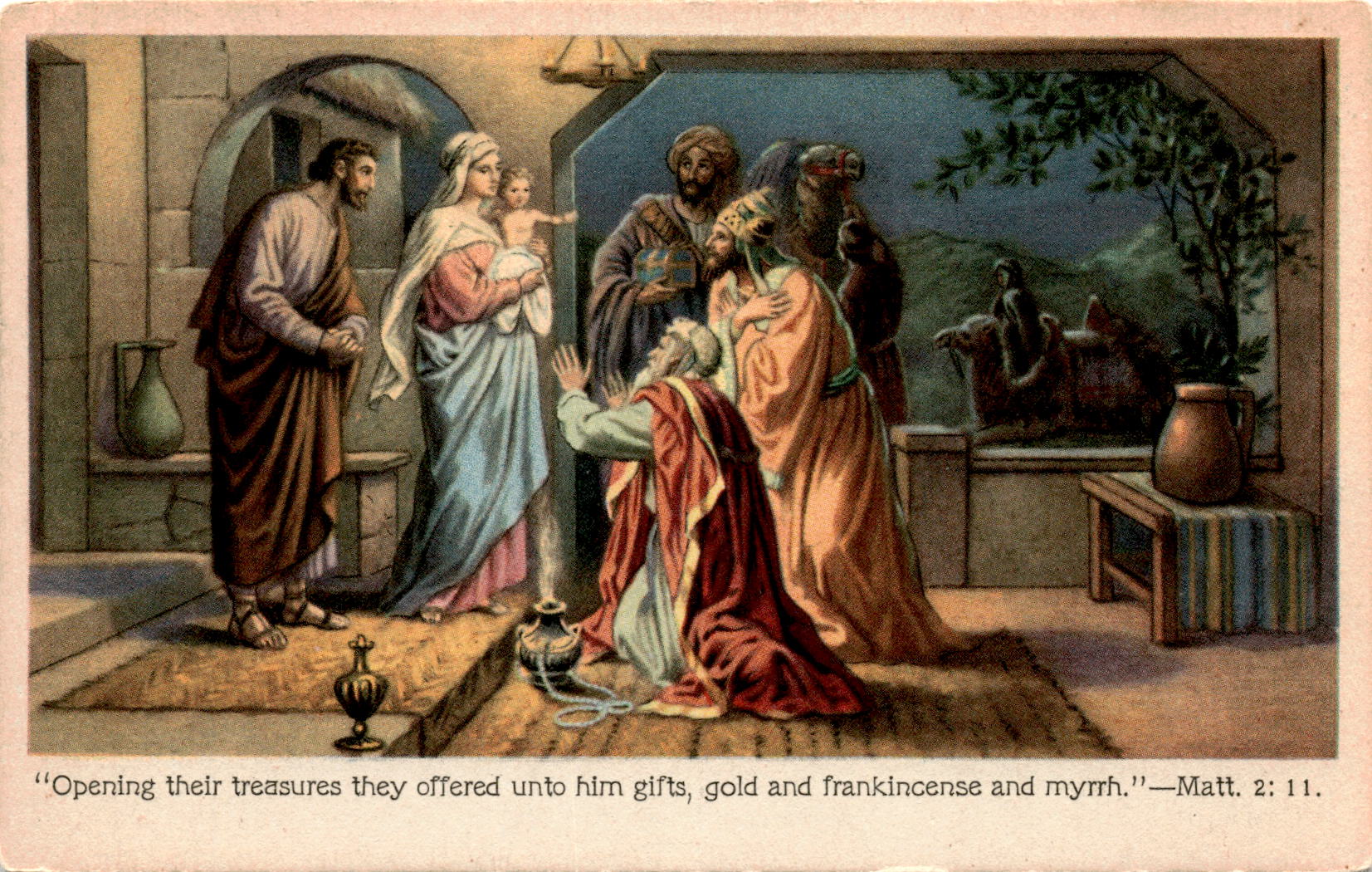 This postcard features a quote from the Bible, specifically Matthew 2:11, which describes the three gifts – gold, frankincense, and myrrh – that the Wise Men presented to Jesus. The postcard is numbered Form 487 and was printed by S. P. Co. in the United States.