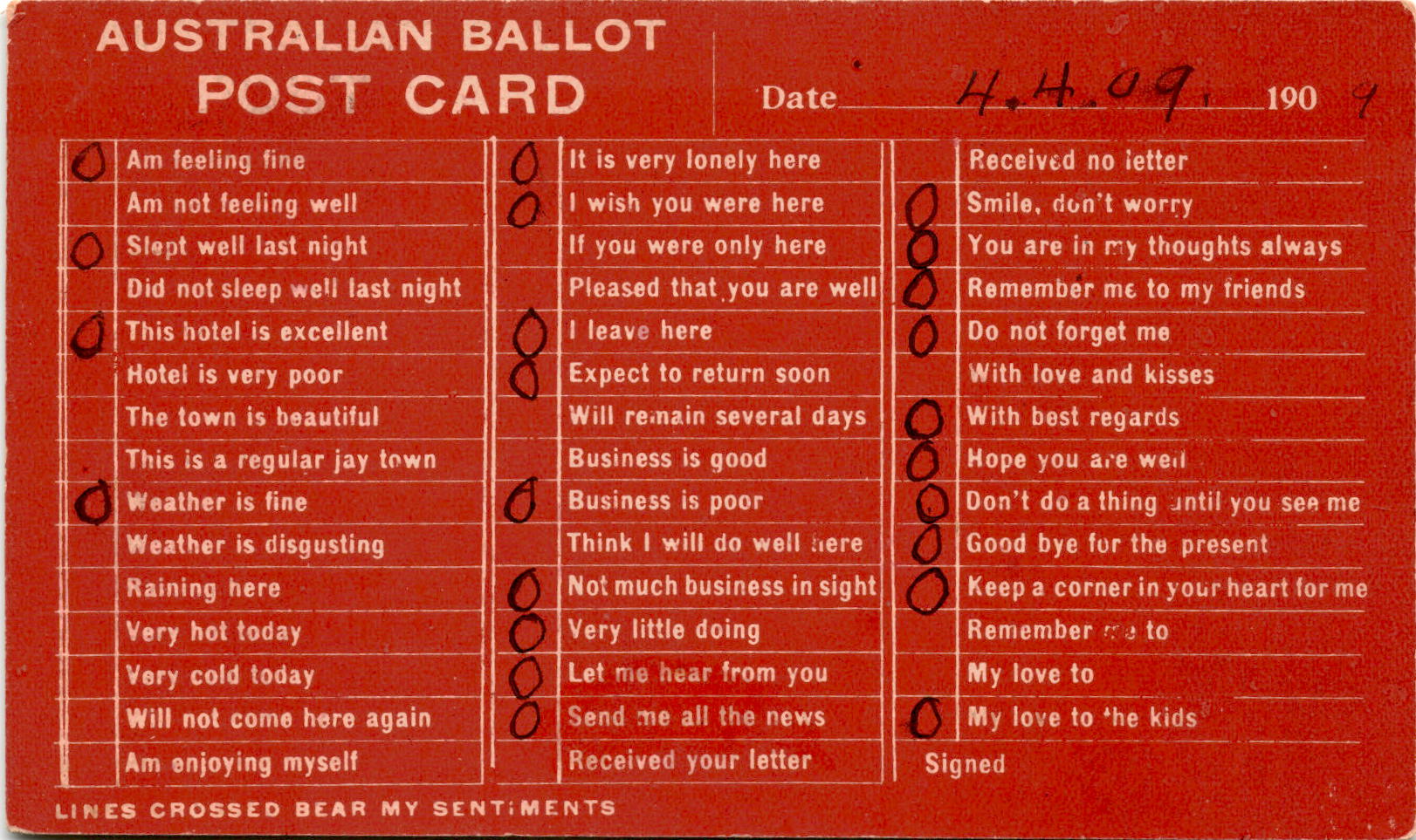 This postcard is a form of an Australian ballot, where the sender can mark their feelings and experiences by checking off various options. The sender can indicate how they are feeling, the quality of the hotel, the town, the weather, and their plans. There are also options to express sentiments like loneliness, missing someone, business conditions, and sending regards.