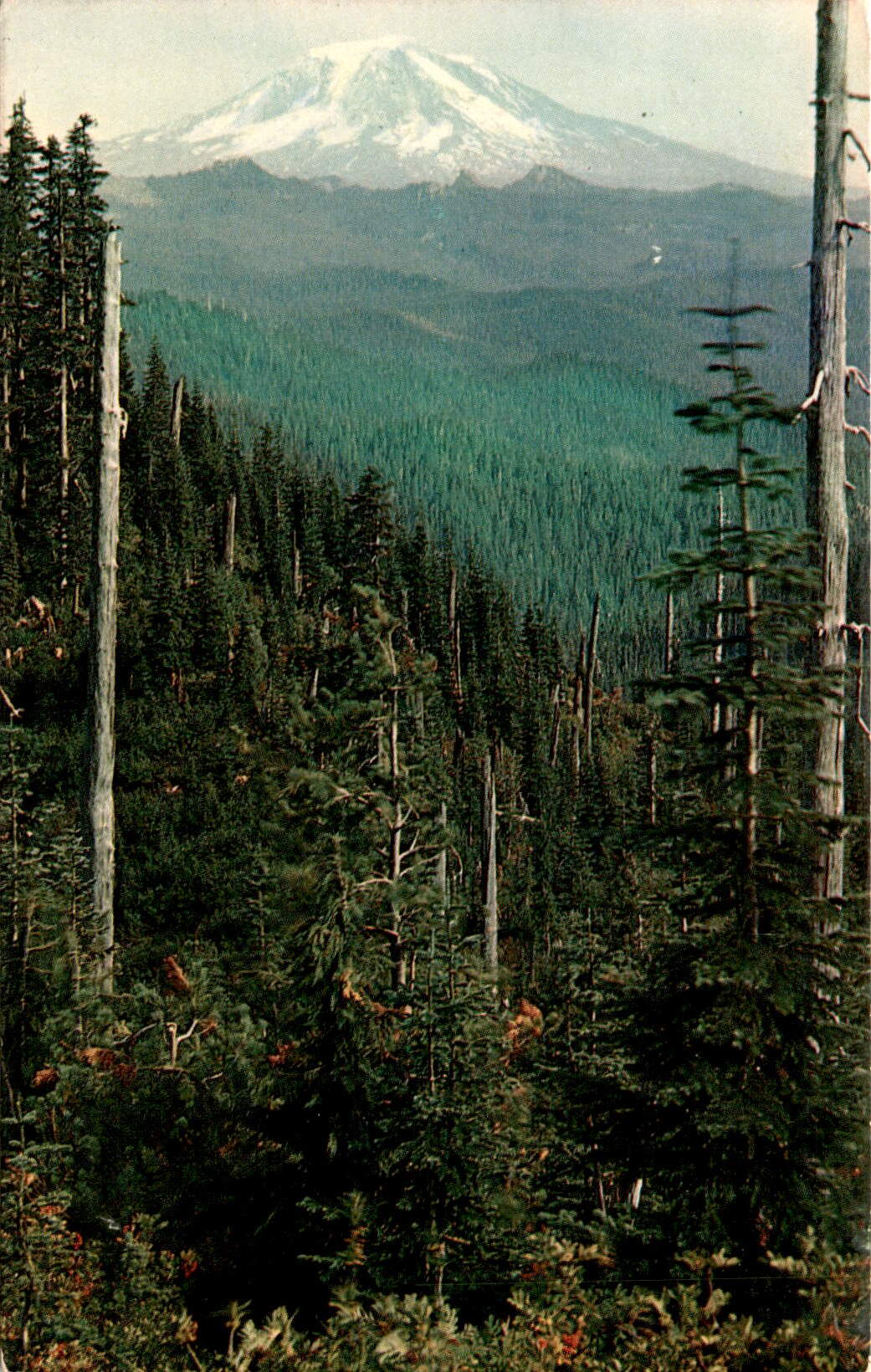 The postcard features a colorful view of Mount Adams, a prominent peak in Washington state with an elevation of 12,307 feet. The image is taken from Bear Pass on the trail to Mount Margaret in the Gifford Pinchot National Forest. The postcard highlights the red berries of dwarf mountain ash in the foreground.