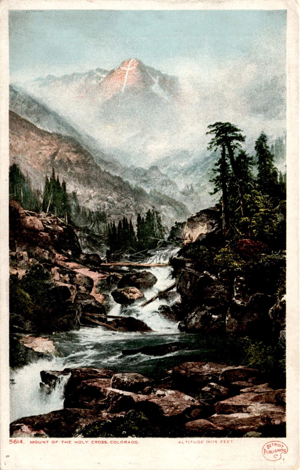The postcard features an image of the Mount of the Holy Cross in Colorado, which has an altitude of 14,176 feet. The postcard was published by the Detroit Publishing Co. and is a Phostint card, a type of colorized postcard popular in the early 20th century.