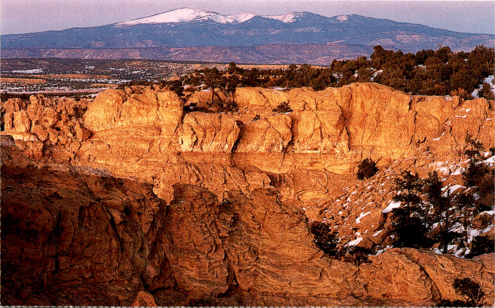 The postcard features a photograph by Laurence Parent showcasing Mt. Taylor towering over the sandstone bluffs of El Malpais National Monument in New Mexico. The text mentions a proposed addition of the Bandera Ice Caves to this geological wonder using two million dollars from the federal Land and Water Conservation Fund.