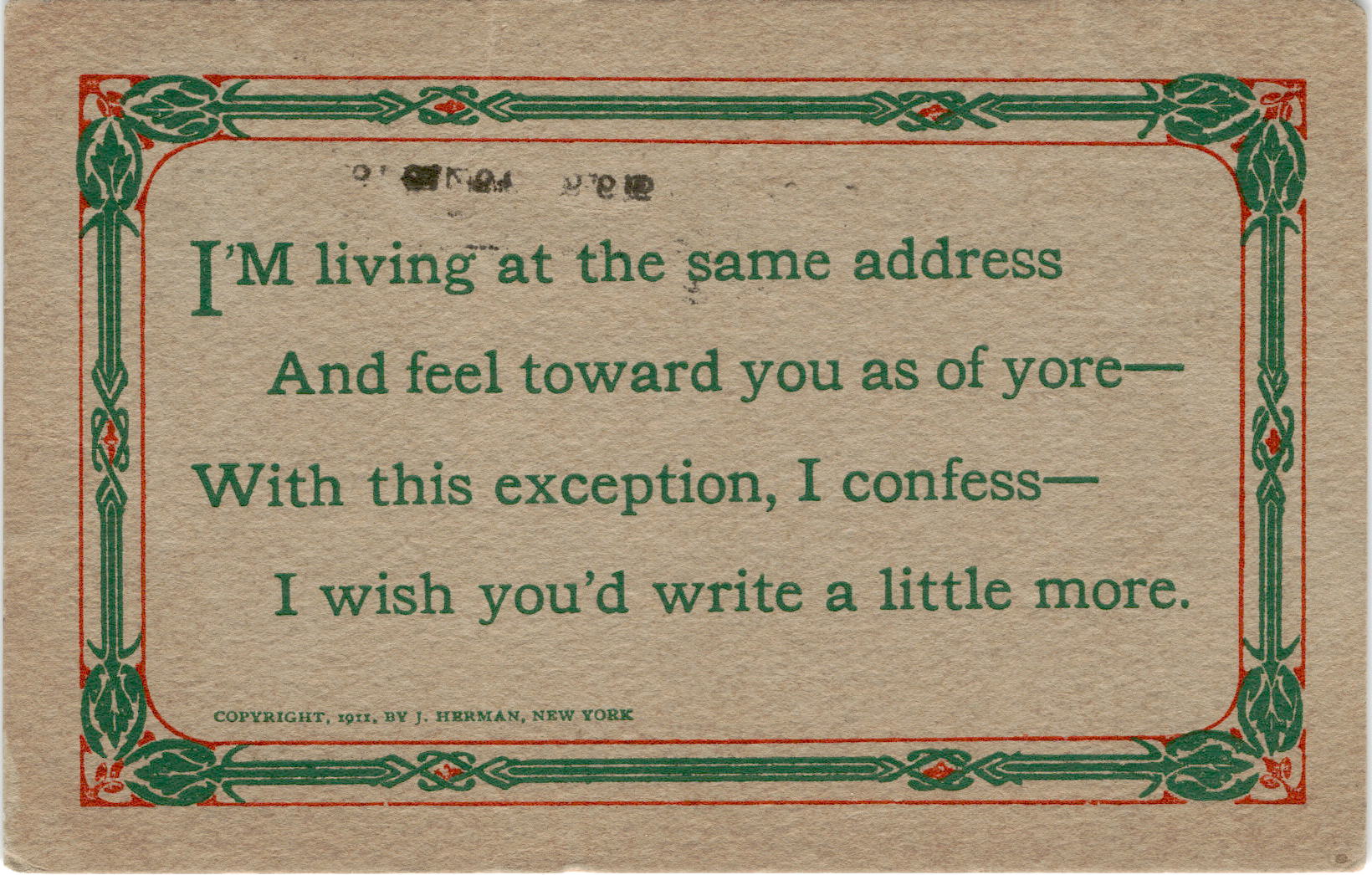 Back of PostcardThe postcard is a personal message from Frances to Miss Nellie Hicks in Langston, Michigan, dated 1911. Frances expresses her desire for more frequent correspondence from Nellie, mentioning that she is living at the same address and still feels the same way toward her.