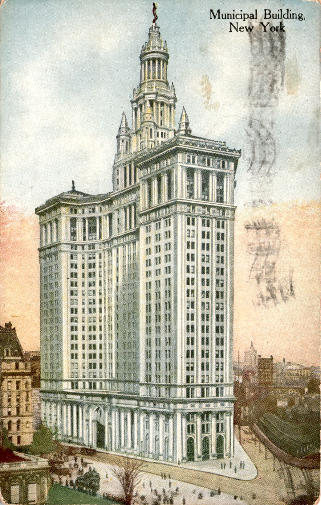 Back of PostcardThe postcard features an image of the Municipal Building in New York City, completed in 1913. This iconic structure on Park Row, facing City Hall Park, is 34 stories tall, with 15 stories in the tower. It houses various city departments’ offices.