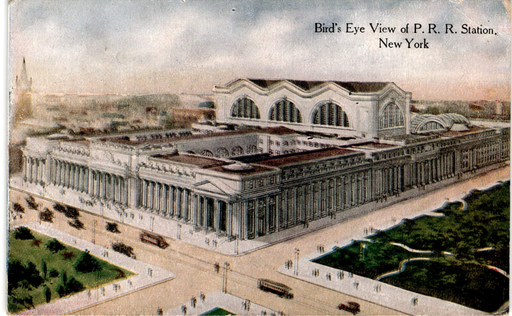 Back of PostcardThe postcard depicts a bird’s eye view of the Pennsylvania Railroad Station in New York City. The station is a massive structure covering the area from Seventh to Eighth Avenues and 31st to 33rd Streets.