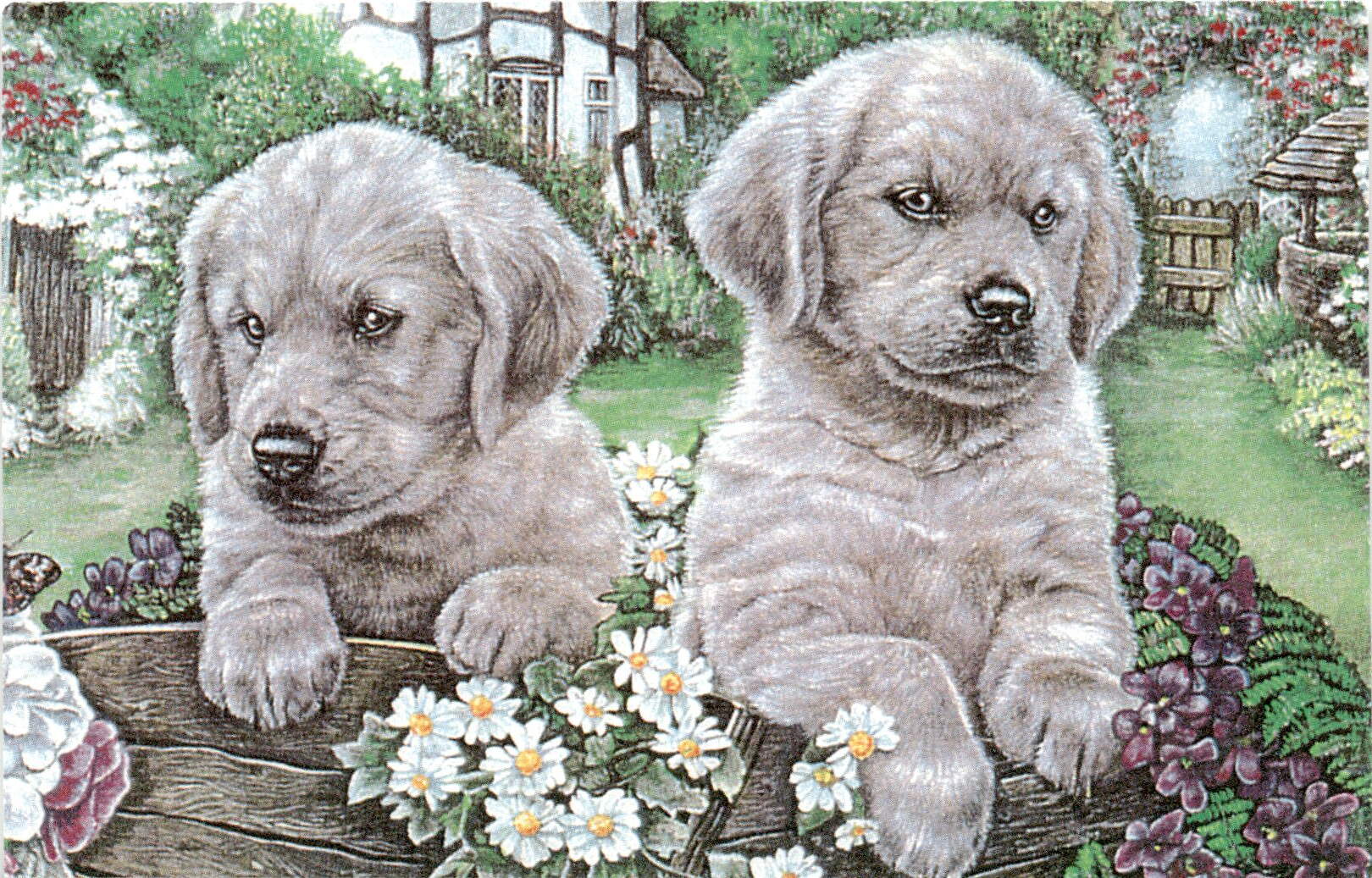 The postcard is promoting the North Shore Animal League, located in Port Washington, NY. This organization is dedicated to rescuing abandoned dogs and cats, providing them with care, and ultimately finding them new homes. The artwork on the postcard is credited to Karen George.