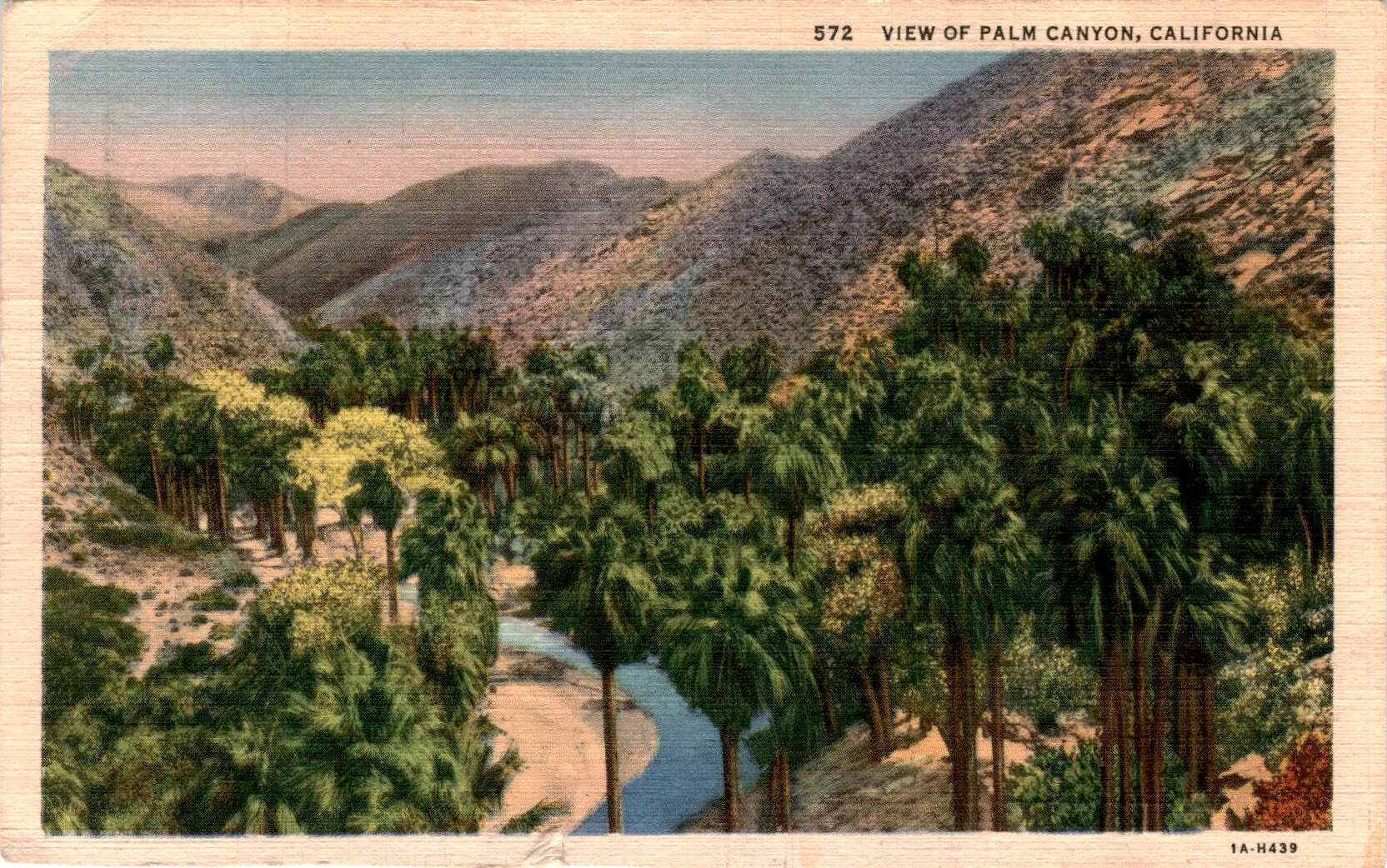 The postcard is a view of Palm Canyon in California, likely from the 1930s. The sender mentions Aunt Hene selling her cafe, which will lead to some changes for the recipient, Marilyn. There is a mention of Drama and Job needing to clean up at home. The sender signs off as Betty, sending love and advising Marilyn to Be good.