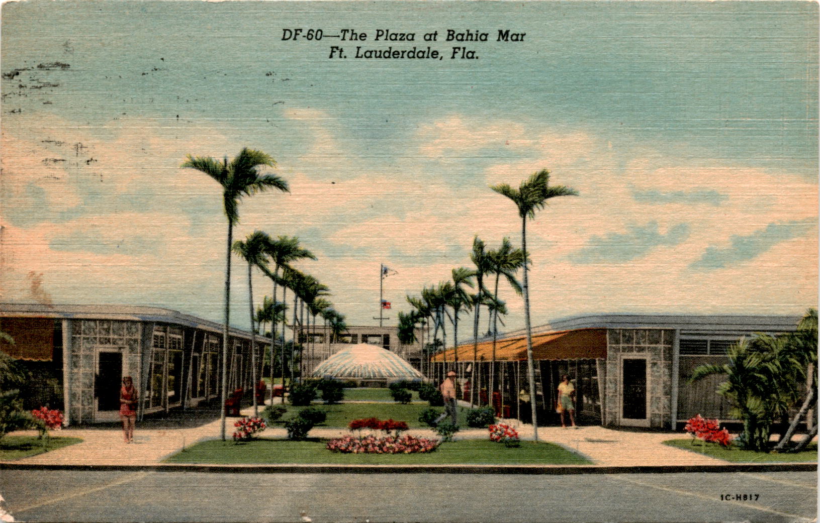 The postcard is from The Plaza at Bahia Mar in Fort Lauderdale, Florida. It is postmarked May 1, 1953, and features a stamp from the United States. The sender mentions being at a hot destination and references stopping for something to eat at a place called Blactic. The postcard also includes an address on W.