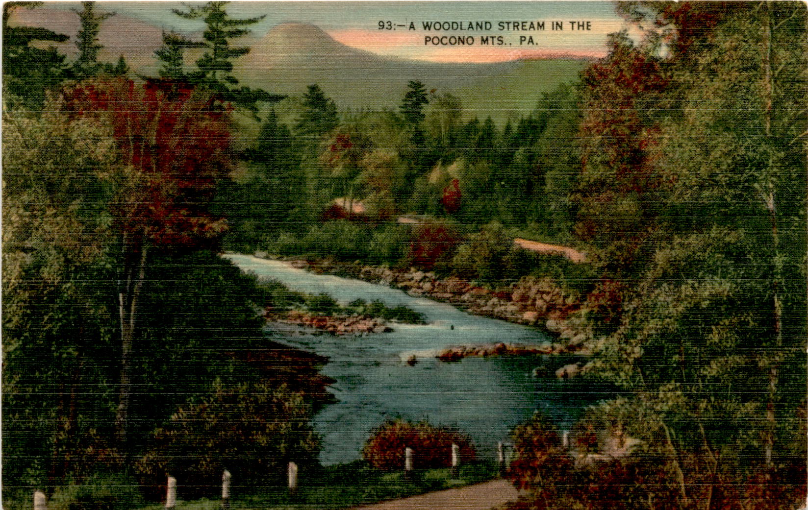 Back of PostcardThe postcard features a woodland stream in the Pocono Mountains, Pennsylvania, published by the Stroudsburg Glass Co. The sender mentions being in Strandaly on a Thursday, with the postmark indicating Burg and Cam. The postcard is addressed to Clare in the United States, with a George Washington 1-cent postage stamp from 1797.