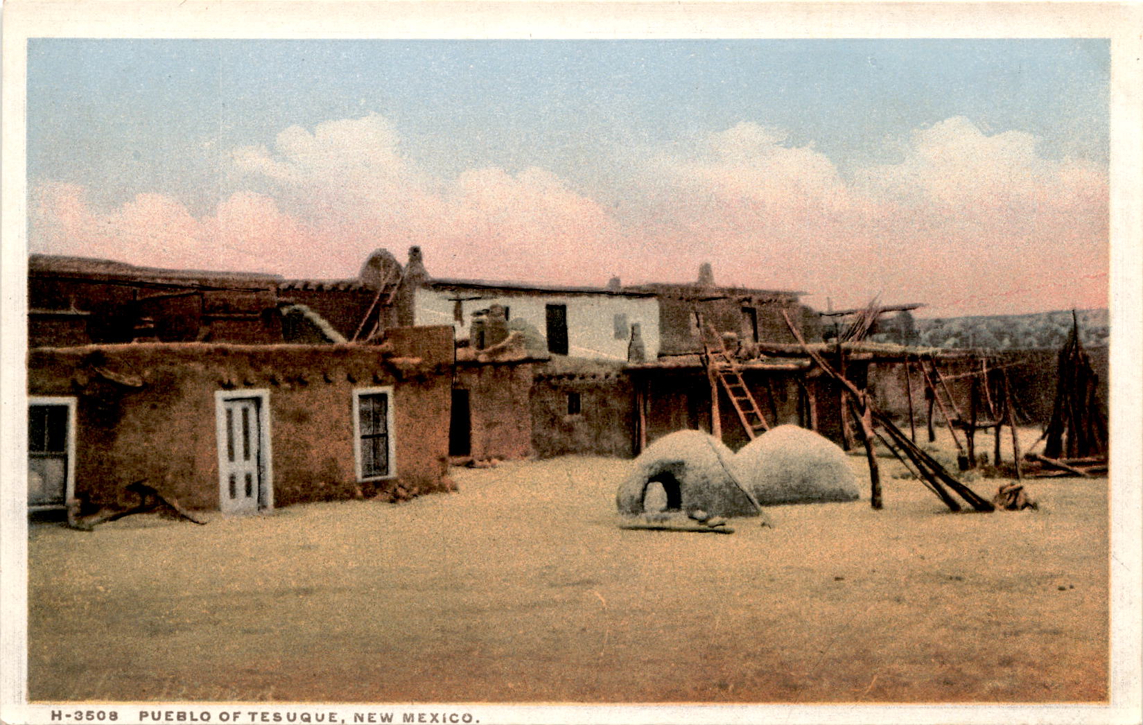 The postcard depicts the Pueblo of Tesuque in New Mexico, a small village located near Santa Fe. The pueblo is known for its inhabitants who engage in traditional crafts such as pottery making, drum making, and crafting bows and arrows.