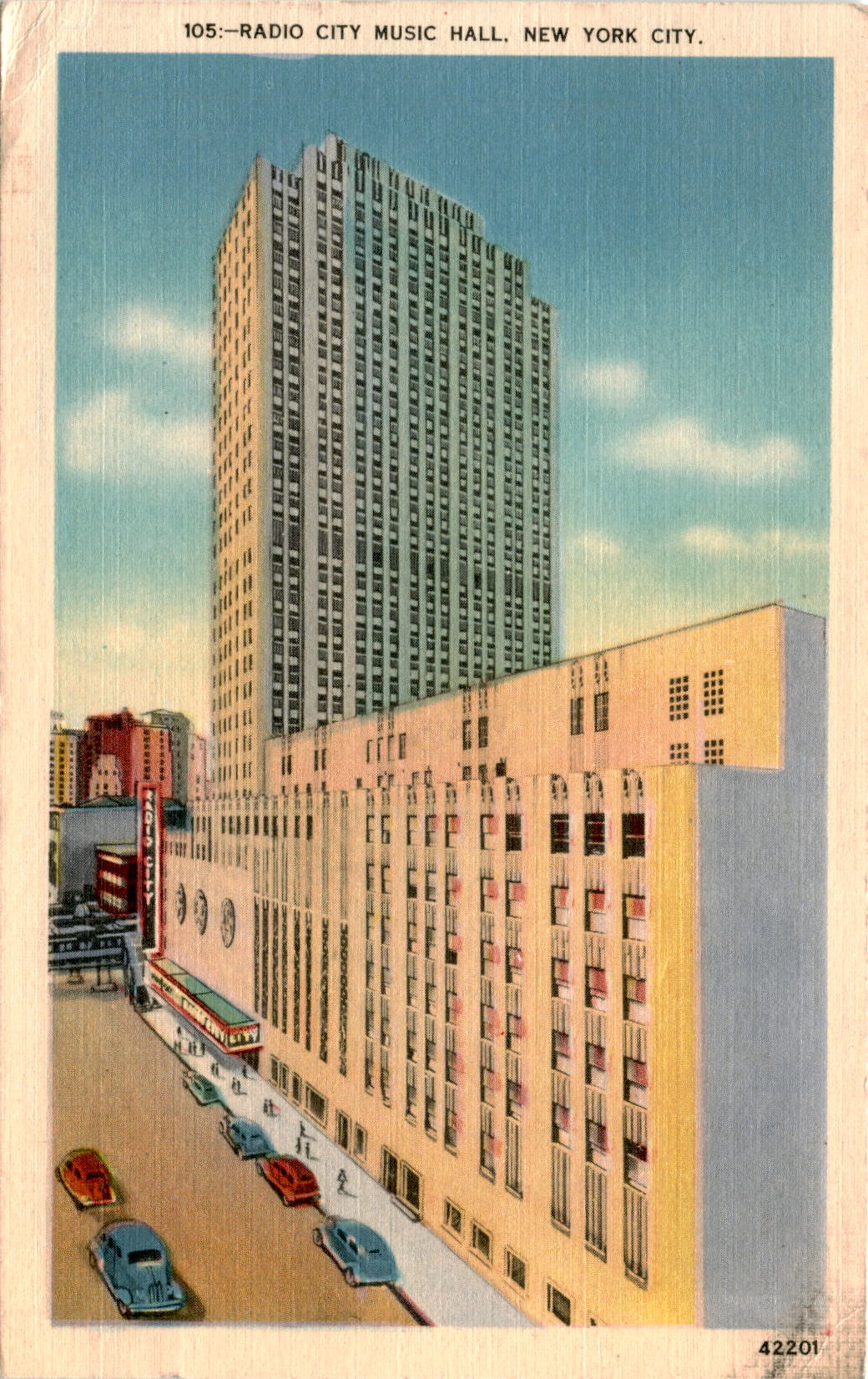 The front of the postcard features an image of Radio City Music Hall in New York City, described as the world’s largest theatre. The image shows the many windowed dressing rooms for artists, the Music Hall’s broadcasting studio on top of the theatre, and the RKO building above.
