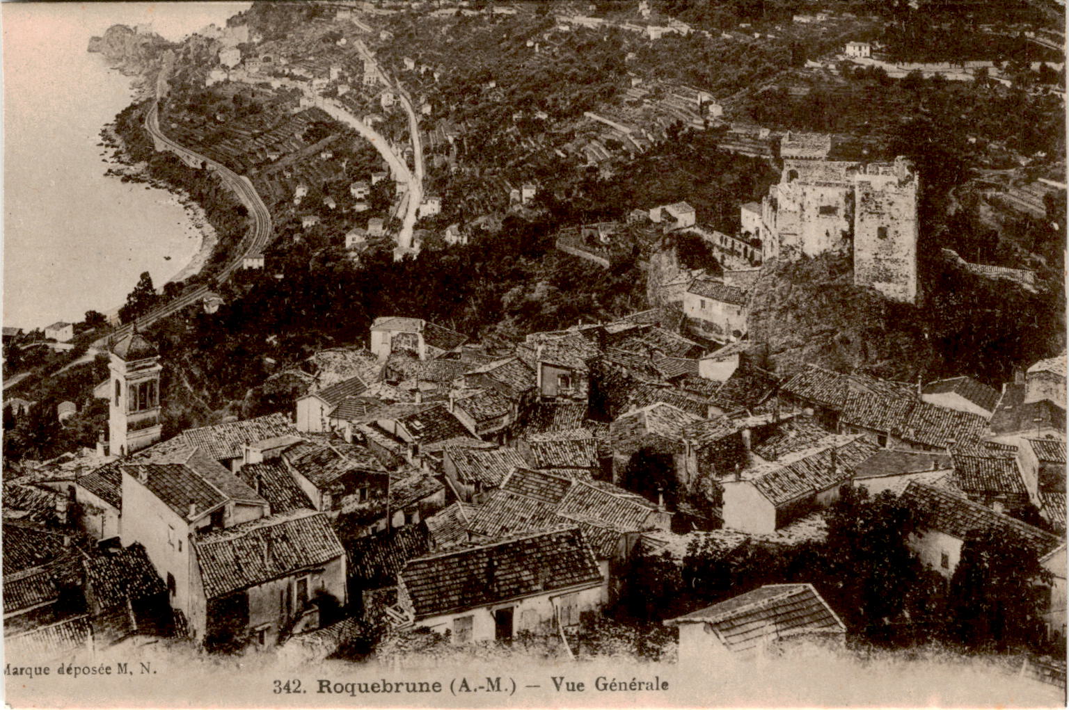 The postcard mentions a trademark Marque déposée M, N and a location Roquebrune (A.-M.) with a general view. Roquebrune is a commune located in the Alpes-Maritimes department in southeastern France. It is known for its picturesque setting overlooking the Mediterranean Sea and its medieval castle.