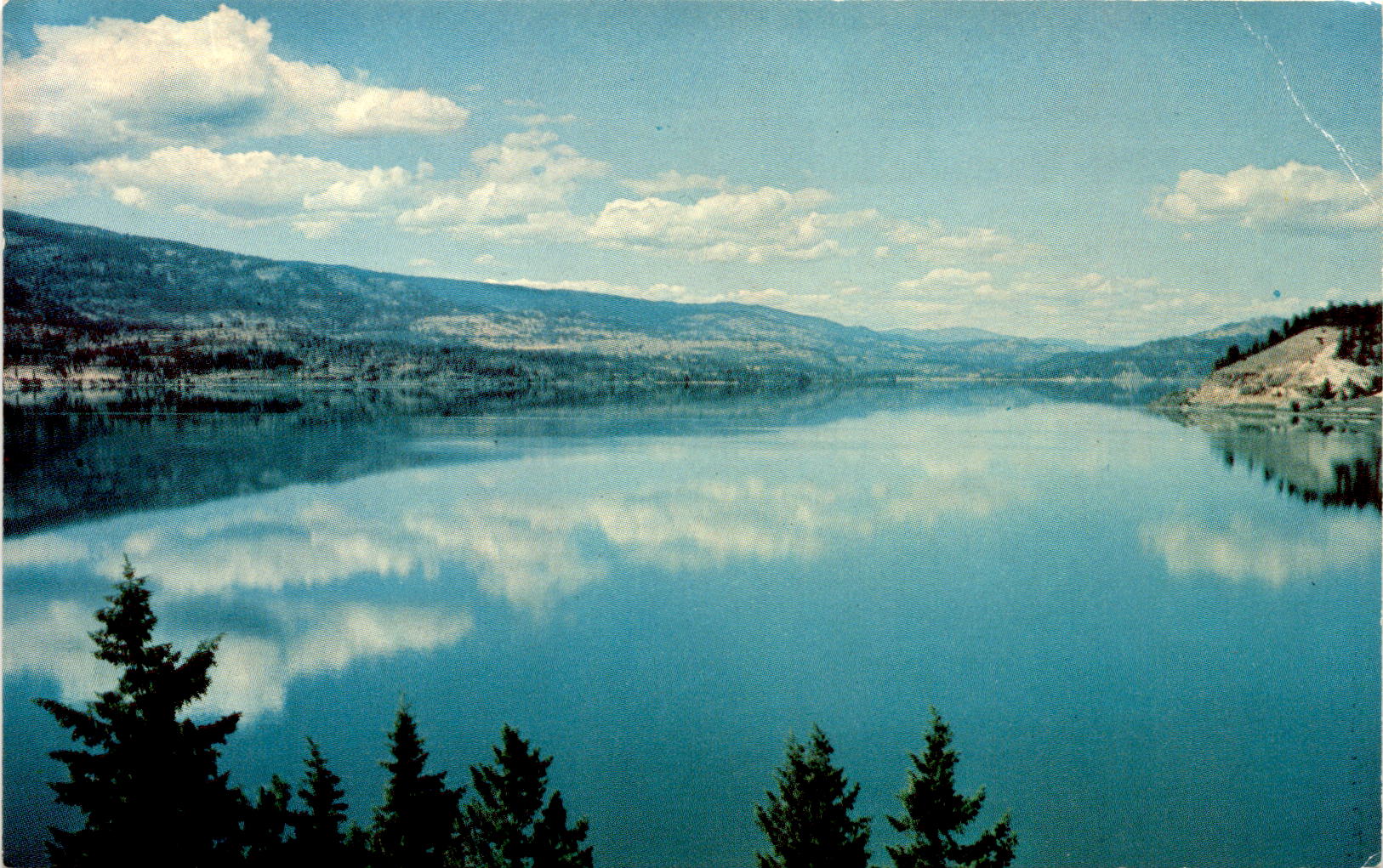 Back of PostcardThe postcard features a scenic view of Lake Roosevelt, a reservoir of the Grand Coulee Dam located near Marcus, Washington. Lake Roosevelt extends all the way to the Canadian border. The Grand Coulee Dam is one of the largest concrete structures in the United States and is a key part of the Columbia Basin Project, providing irrigation water and hydroelectric power to the region.