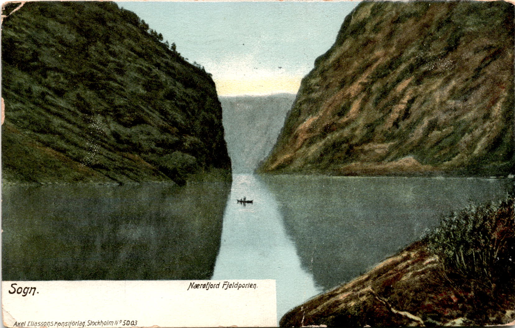 The postcard is a scenic image of Sogn, specifically Nærafjord Fjeldporten, a mountain pass in Norway. The postcard is produced by Axel Eliassons Konstförlag in Stockholm.