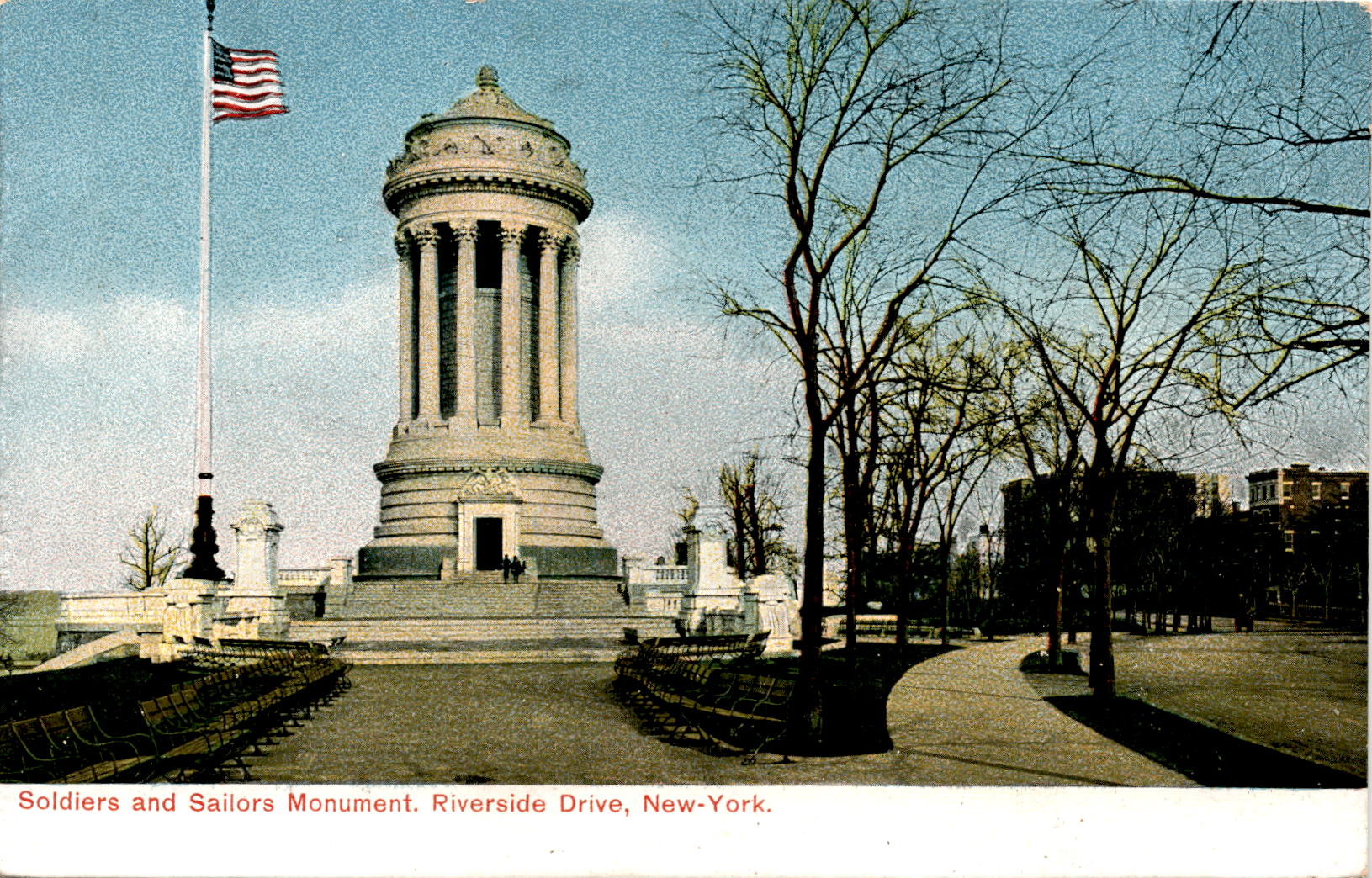The postcard features an image of the Soldiers and Sailors Monument located on Riverside Drive in New York. The monument is a prominent landmark in the city, dedicated to honoring the soldiers and sailors who served in the American Civil War. The Soldiers and Sailors Monument was designed by architects Charles and Arthur Stoughton and was unveiled in 1902.