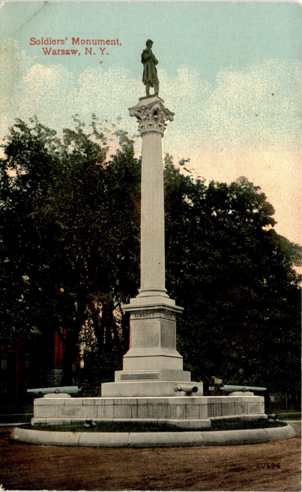 The postcard features an image of the Soldiers’ Monument in Warsaw, New York. The monument is a tribute to soldiers who fought in various wars. Warsaw is a town located in Wyoming County, New York, known for its historic sites and monuments.The Soldiers’ Monument in Warsaw is a significant landmark honoring the bravery and sacrifice of soldiers from the area.