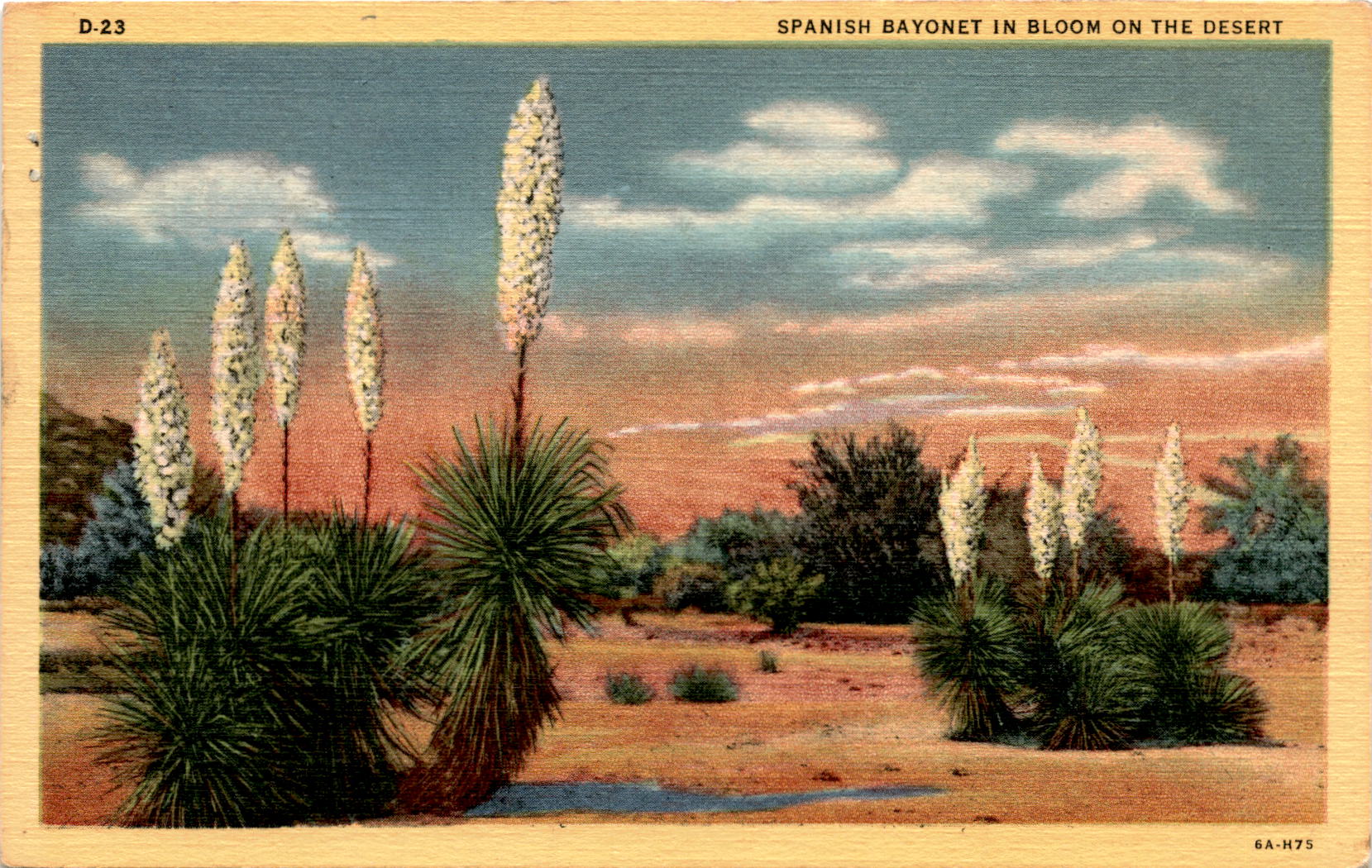 This postcard features an image of a Spanish Bayonet plant in bloom in the desert. The plant is described as towering from its bristling leaves and adding enchanting beauty to the desert landscape. The postcard is a genuine Curteich-Chicago C.T. Art-Colortone postcard, distributed by Lollesgard Specialty Co.