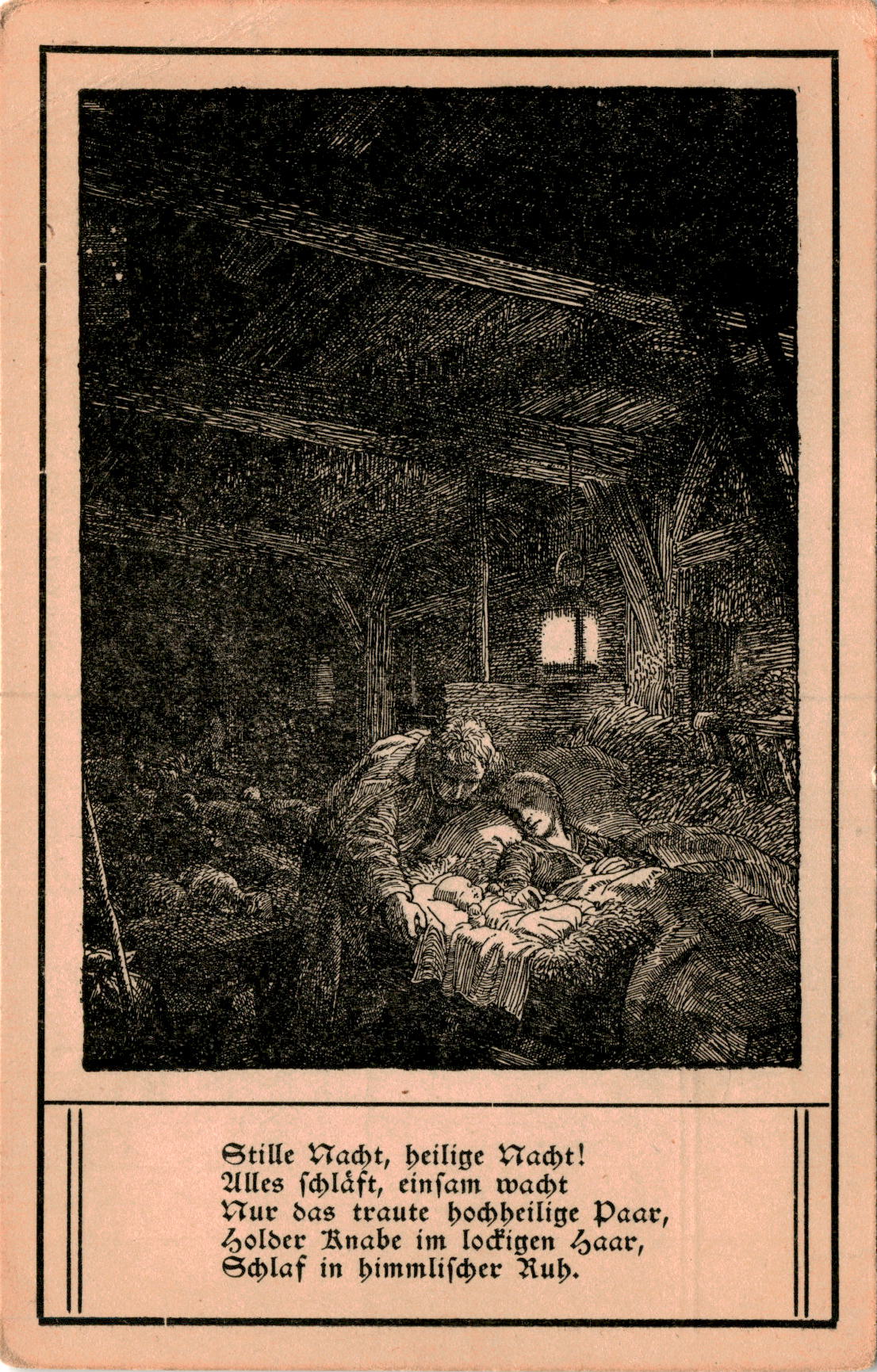 Back of PostcardThe postcard features a verse from the famous Christmas carol Stille Nacht, heilige Nacht (Silent Night, Holy Night) which was written, composed, and first performed on December 24, 1818. The lyrics were penned by the Catholic priest Joseph Mohr from St.