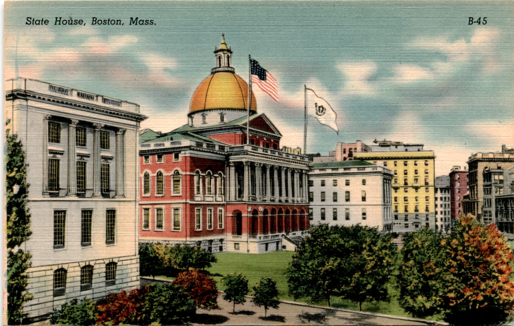 The postcard features an image of the State House in Boston, Massachusetts, located on Beacon Hill, which was originally called Trimount Hill. The State House comprises the Bulfinch front, an extension, and the East and West Wings. The iconic gilded dome has been repainted gray during the war.