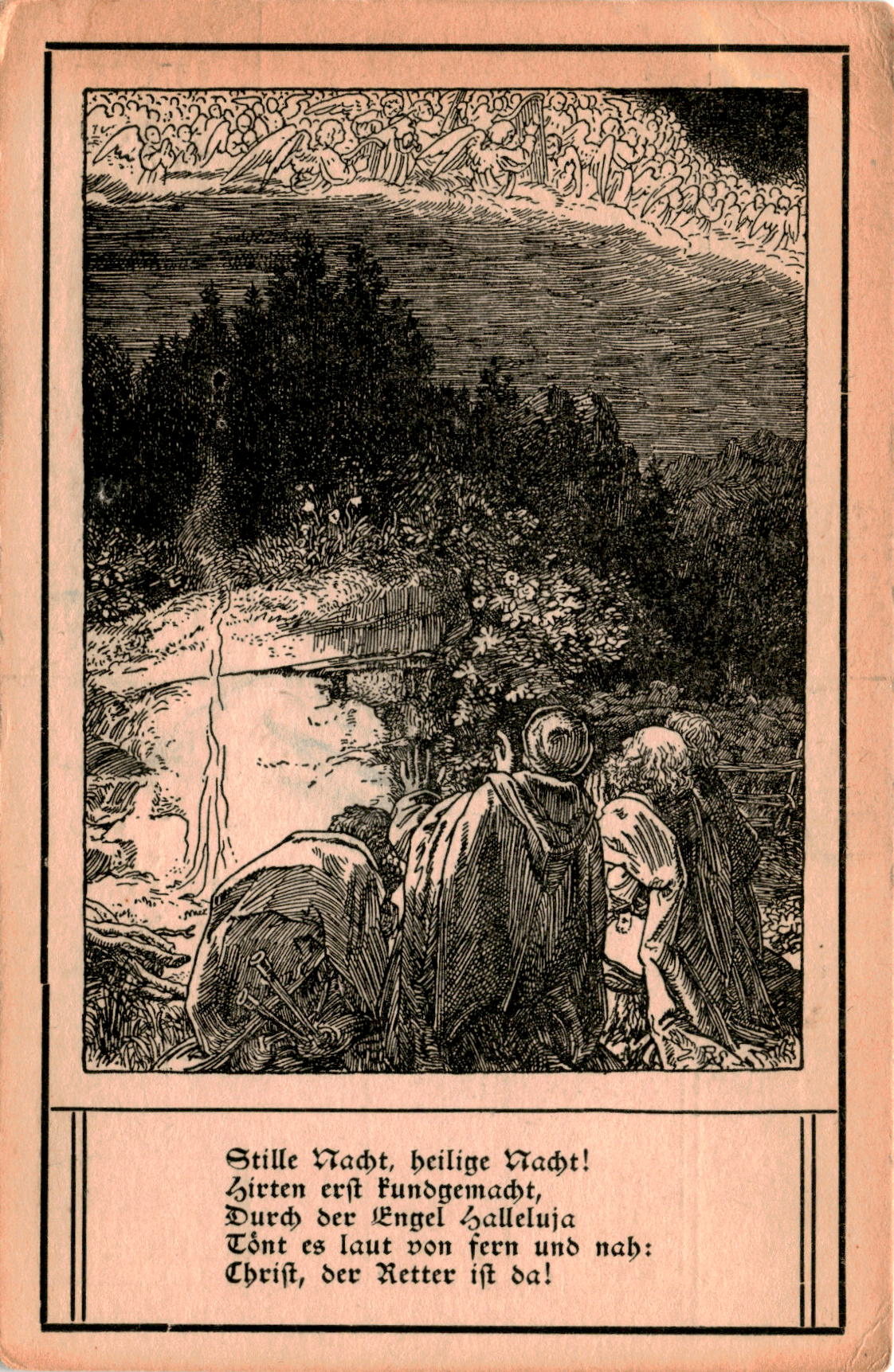 The text on the postcard is a verse from the famous Christmas carol Stille Nacht, heilige Nacht! (Silent Night, Holy Night!). It mentions how the song was first sung on December 24, 1818, with six verses, accompanied by a guitar due to the lack of an organ.