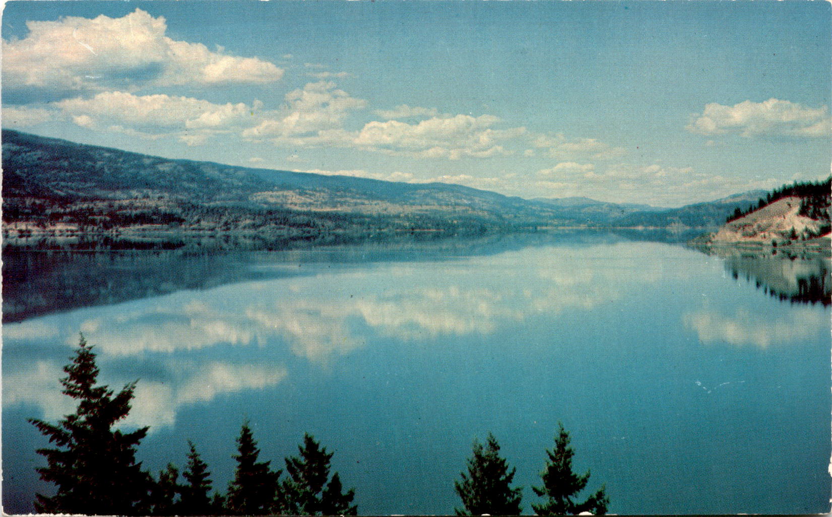 The postcard features Lake Roosevelt, which is a reservoir created by the Grand Coulee Dam in Washington state. The lake extends all the way to the Canadian border. The view on the postcard shows Lake Roosevelt looking north from a location near Marcus, Washington.- **Lake Roosevelt**: Lake Roosevelt is a large reservoir on the Columbia River in Washington state.