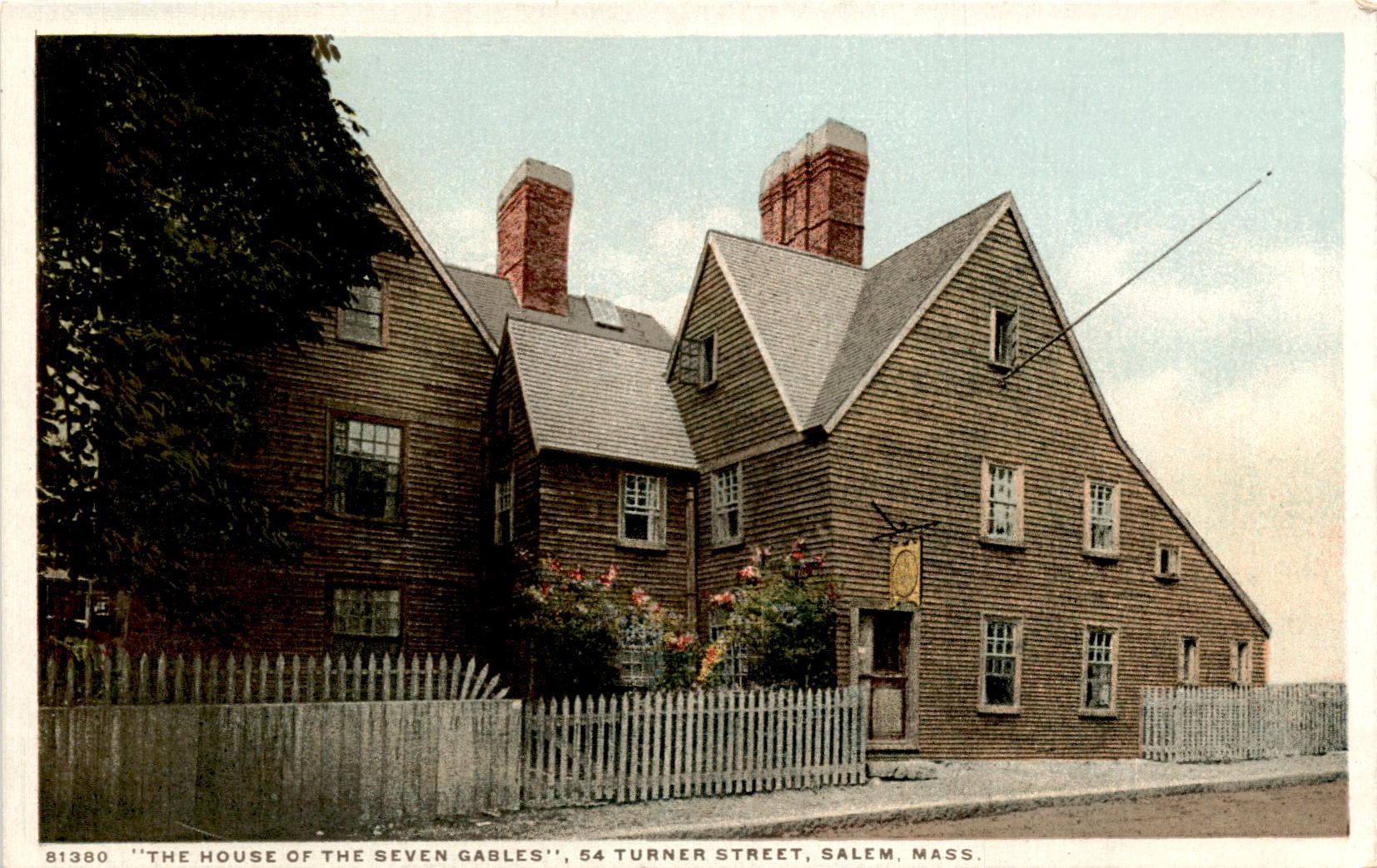 The postcard features an image of The House of the Seven Gables located at 54 Turner Street in Salem, Massachusetts. The image is a Phostint trade mark, made exclusively by the Detroit Publishing Co.