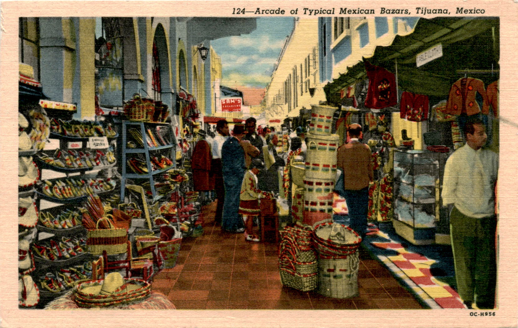 The postcard is from Tijuana, Mexico, featuring an image of the Arcade of Typical Mexican Bazars. It is addressed to someone in Texas, USA, and mentions the sender having a wonderful time in Mexico. The postcard is dated February 28, 1957, and is stamped with various postal markings.