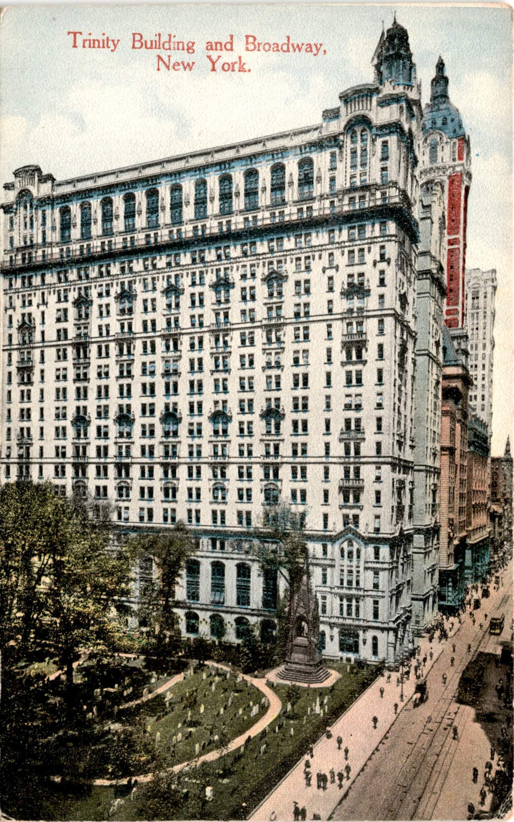 The Trinity Building is a modern office building located at 111 Broadway in New York City, just south of Trinity Church. It is known for its pure Gothic architecture and stands at a height of 308 feet. The building is supported by 70 pneumatic caissons, each sunk 75 feet below the sidewalk.