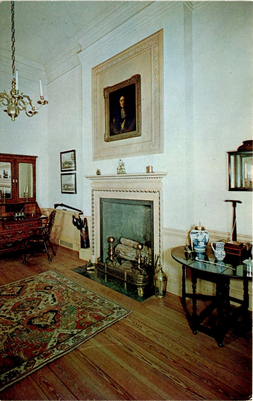 The postcard features Tryon Palace in New Bern, North Carolina, which was the first permanent capitol of North Carolina. The palace was built by Royal Governor William Tryon between 1767-1770. It was restored between 1952-1959 through the contributions of Mrs.