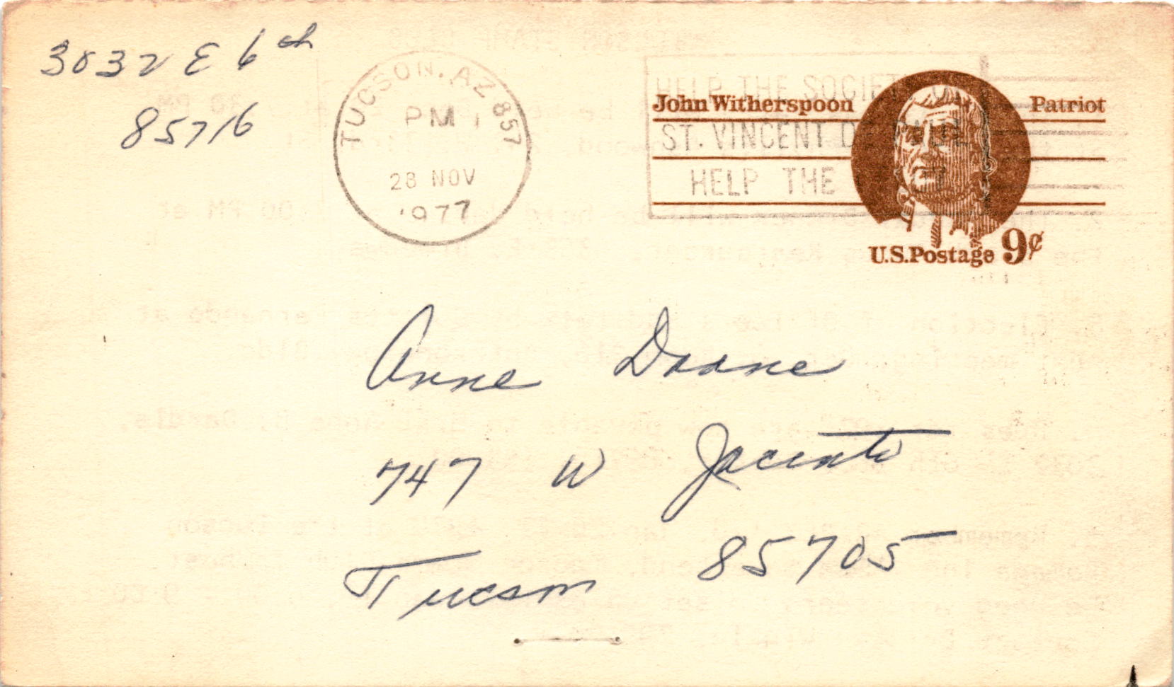 The postcard is from the Tucson Stamp Club, providing information about upcoming events and announcements. Here are the main details mentioned:1. **Christmas Party**: Scheduled for December 20 at 7:30 PM at the home of Phyllis Ashwood, located at 243 W. 33rd St.2.