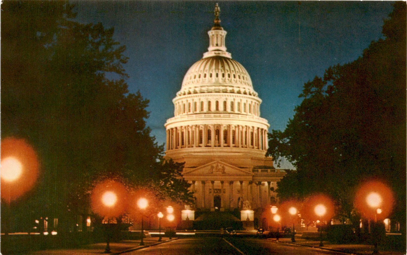 The postcard features a nighttime view of the U.S. Capitol Dome in Washington, D.C. The Capitol Building, designed by Dr. William Thornton, is situated on a hill and is a prominent structure in the city. The design of the Capitol Building was selected through a prize competition. The postcard was published for Washington Novelty Inc.