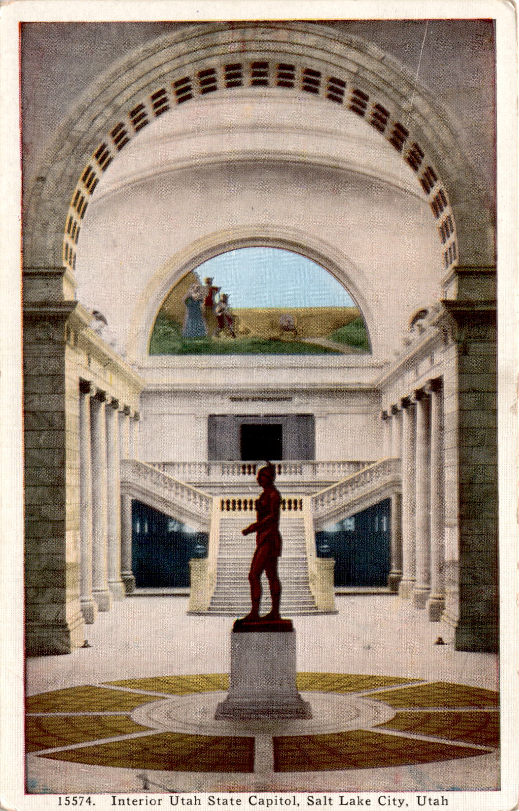 Back of PostcardThe postcard features an image of the interior of the Utah State Capitol in Salt Lake City. The card mentions a replica of Massasoit, originally made by Cyrus E. Dallin, a famous artist from Utah. The mural painting on the card depicts the trek of the Pioneers across the Great American Desert, created by a local artist.