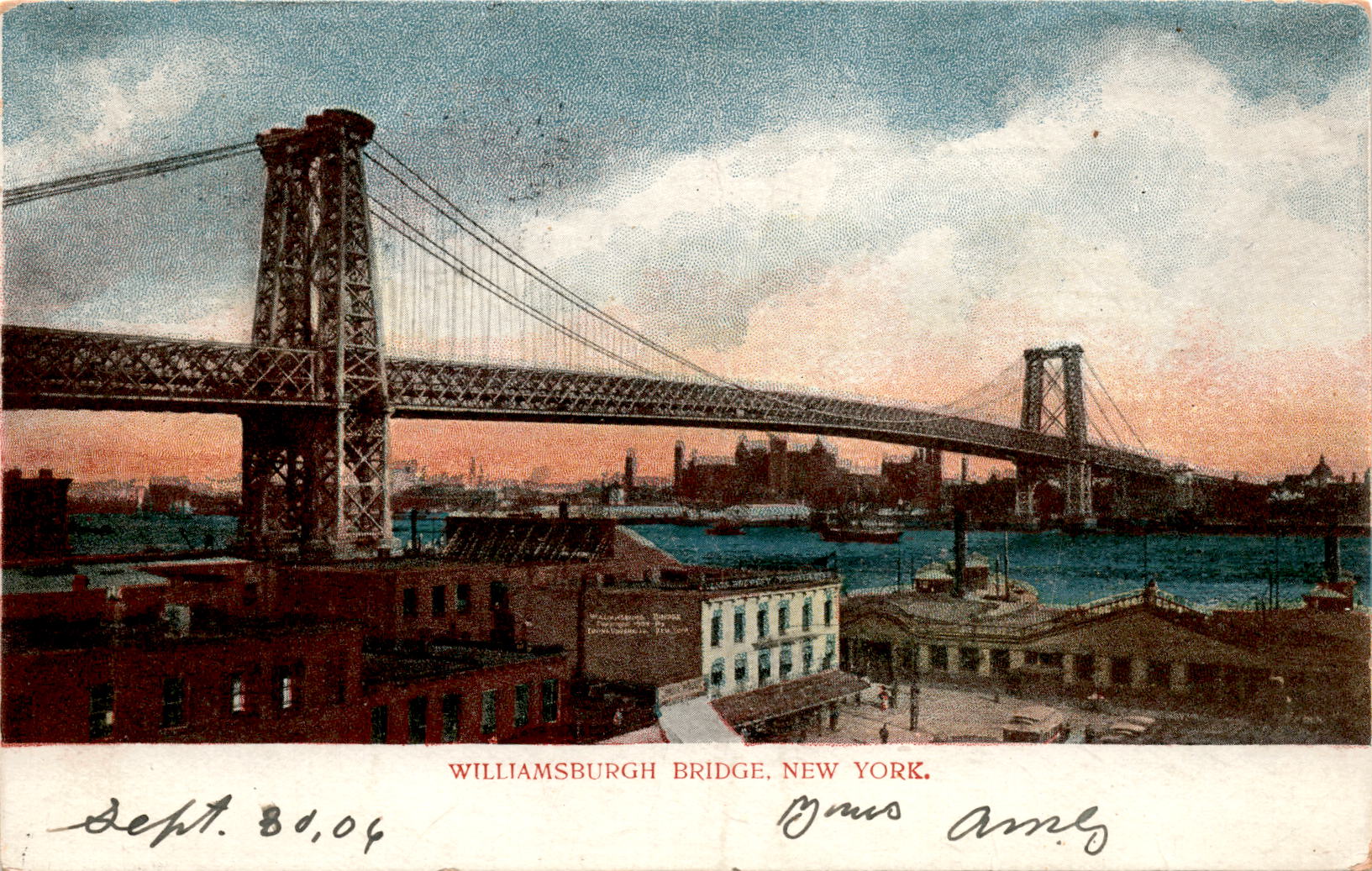 The postcard is a picture of the Williamsburgh Bridge in New York, dated September 30, 1904. The front of the postcard contains the image of the bridge, while the back includes a stamp box with the words THIS SIDE IS EXCLUSIVELY FOR THE ADDRESS and some handwritten text addressed to Miss Erglin R.