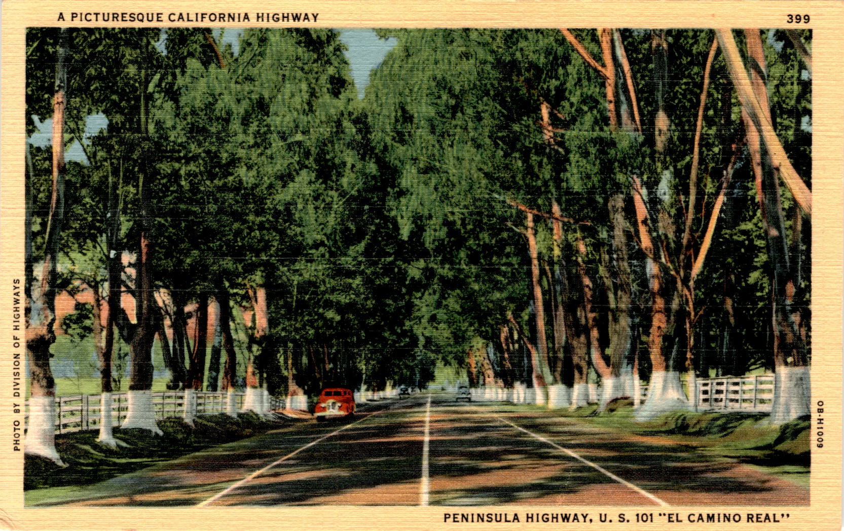 This postcard features a picturesque California highway, specifically Peninsula Highway, also known as U.S. 101 or El Camino Real. The photo was taken by the Division of Highways and is part of the Pictorial Wonderland Art Tone Series by Stanley A. Piltz Company in San Francisco, California.