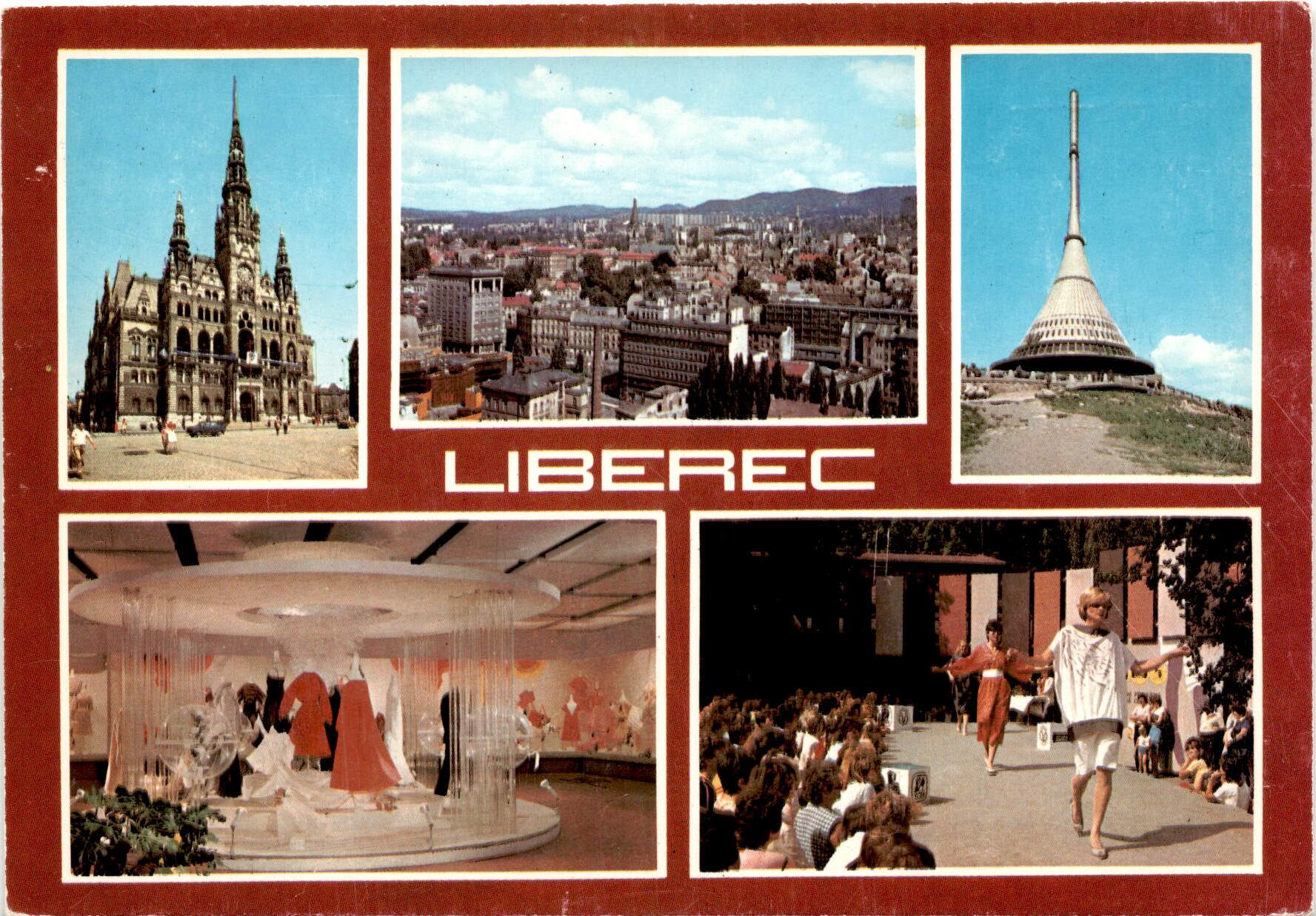 The postcard features images of Liberec, a city in the Czech Republic, and Františkovy Lázně, a spa town in the same country. Liberec is known for its beautiful architecture, including the Neo-Renaissance town hall and the Jested Tower, a unique futuristic structure.