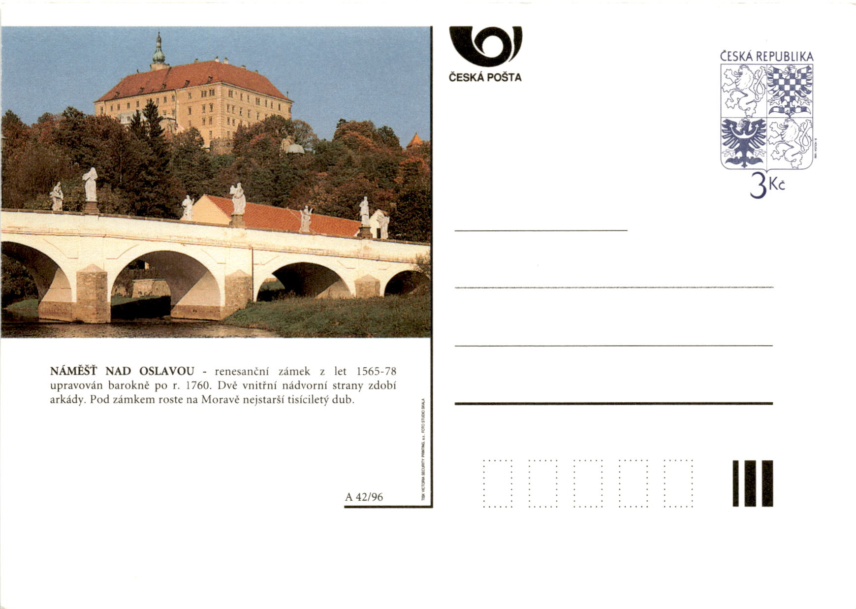 Back of PostcardThe postcard features a Renaissance castle in Náměšť nad Oslavou, Czech Republic, built between 1565-1578 and later renovated in a Baroque style after 1760. The castle is adorned with arcades on two inner courtyard sides. Beneath the castle grows the oldest thousand-year-old oak tree in Moravia.