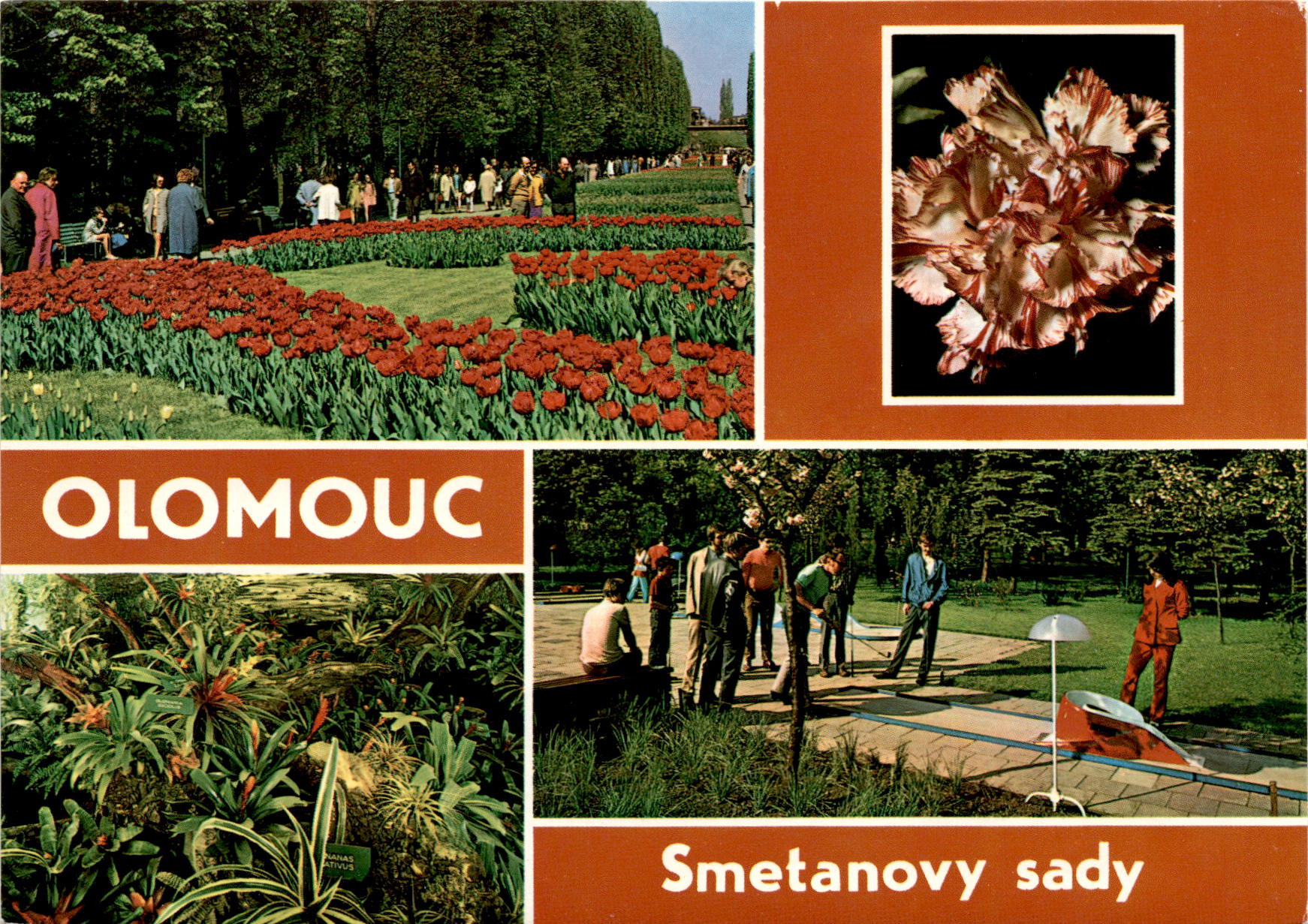 This postcard is a promotional material for the city of Olomouc, known for its flower exhibitions and the World Congress of Speleologists. The front of the postcard features a photograph by Josef Sekal showing Smetanovy sady, a park in Olomouc, during the Flora exhibition.