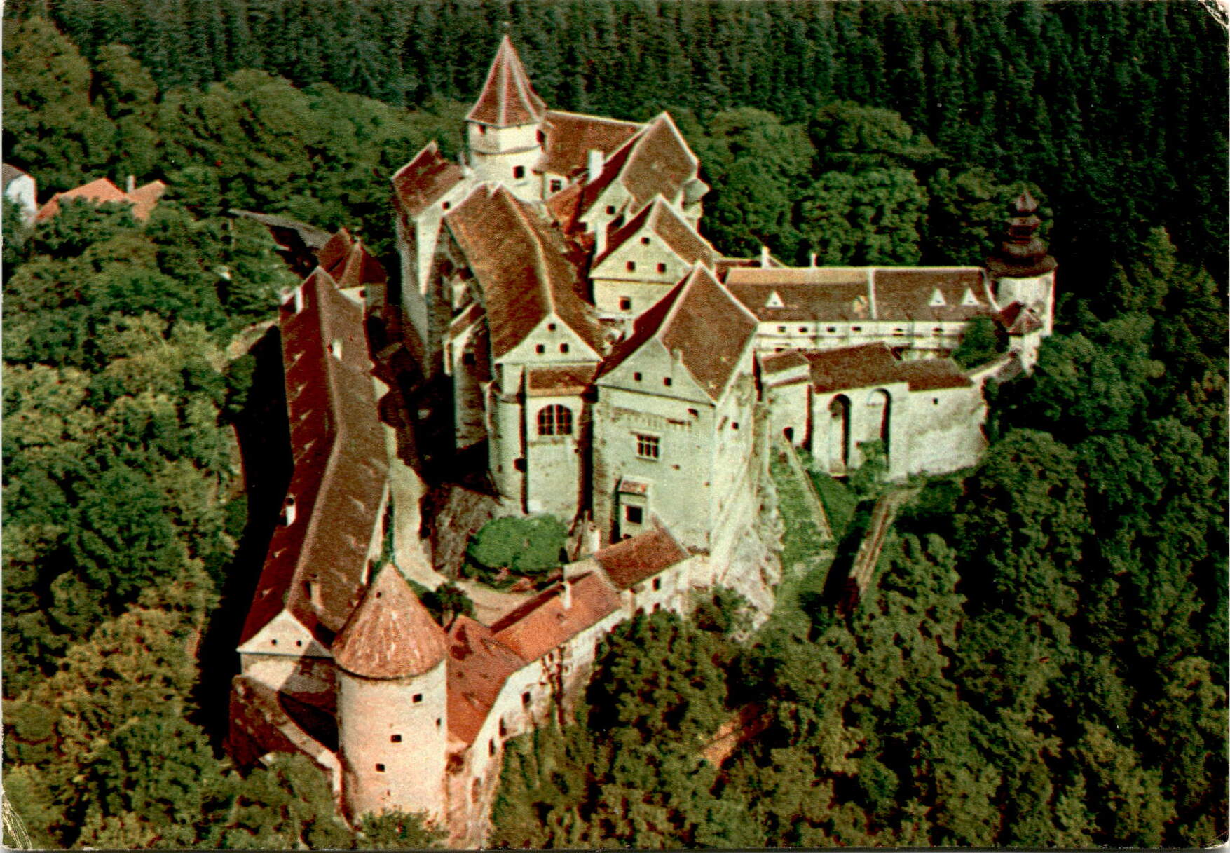 The postcard features a photo of Pernštejn Castle, a state castle built as a strong defensive structure that retained its defensive function even after renovations in the late 15th century. Pernštejn Castle is renowned for its stunning location in the landscape and its perfect architectural appearance. The photo is credited to E. Vasiliak.