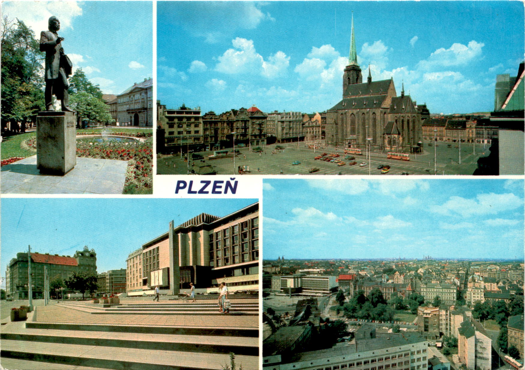 Back of PostcardThe postcard features a photograph of the city center of Plzeň, specifically Smetanovy sady (Smetana Gardens), the State Bank, and Náměstí Republiky (Republic Square). The photo was taken by V. Halada, B. Hořínek, and M.