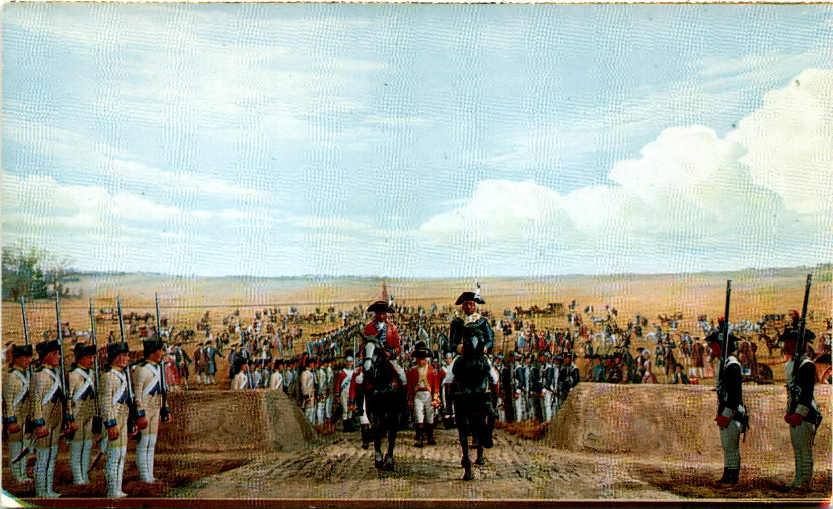 The postcard depicts the surrender at Yorktown in 1781, a significant event during the American Revolutionary War. Major General Benjamin Lincoln led Brigadier General Charles O’Hara, representing General Cornwallis, onto the field for the formal surrender on October 19, 1781.
