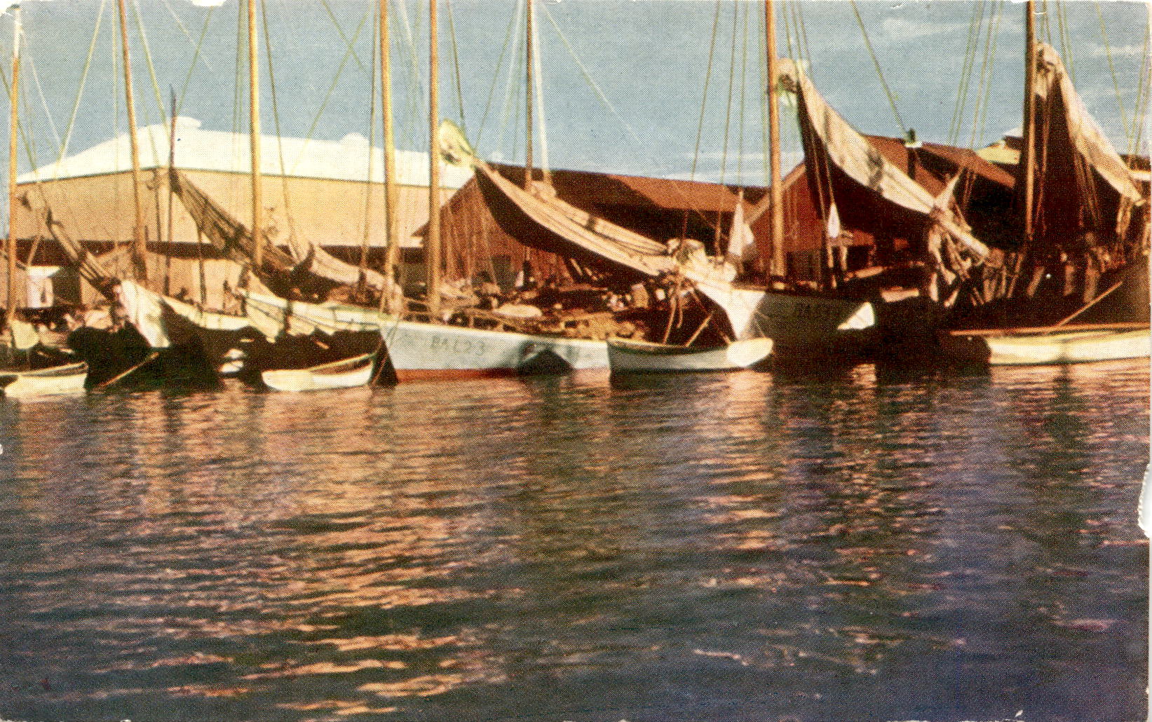 The postcard features a colored photograph of fishing boats at Market Wharf in Nassau. The image was taken by F. S. Armbrister and the copyright is held by Lightbourn Pharmacy in Nassau. The postcard was printed in Scotland by Robert MacLehose & Co. Ltd in Glasgow.