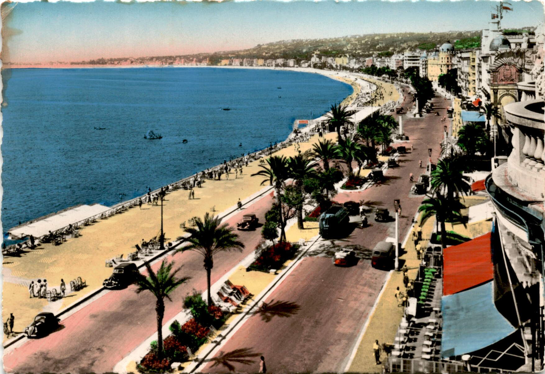 This postcard features a view of La Promenade des Anglais in Nice, France. The Promenade des Anglais is a famous promenade along the Mediterranean Sea in Nice, known for its stunning views and vibrant atmosphere. Nice is a city located on the French Riviera, renowned for its beautiful beaches, Mediterranean climate, and rich cultural heritage.