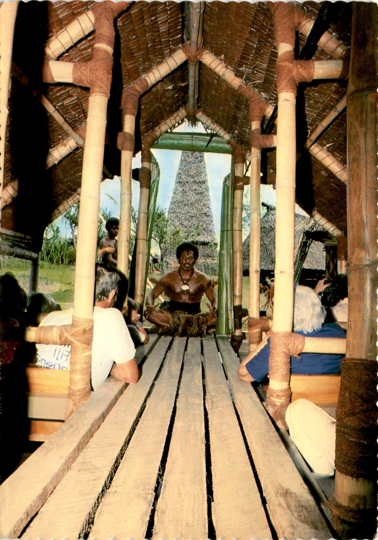 Back of PostcardThe postcard features the Ligu Cultural Centre and Market Place in Pacific Harbour, Fiji. The tour guide at the center is depicted in traditional costume, sharing insights into the pre-European lifestyle of the Fijian people from 200 years ago. The photo on the postcard was taken by Ikbal Jannif.