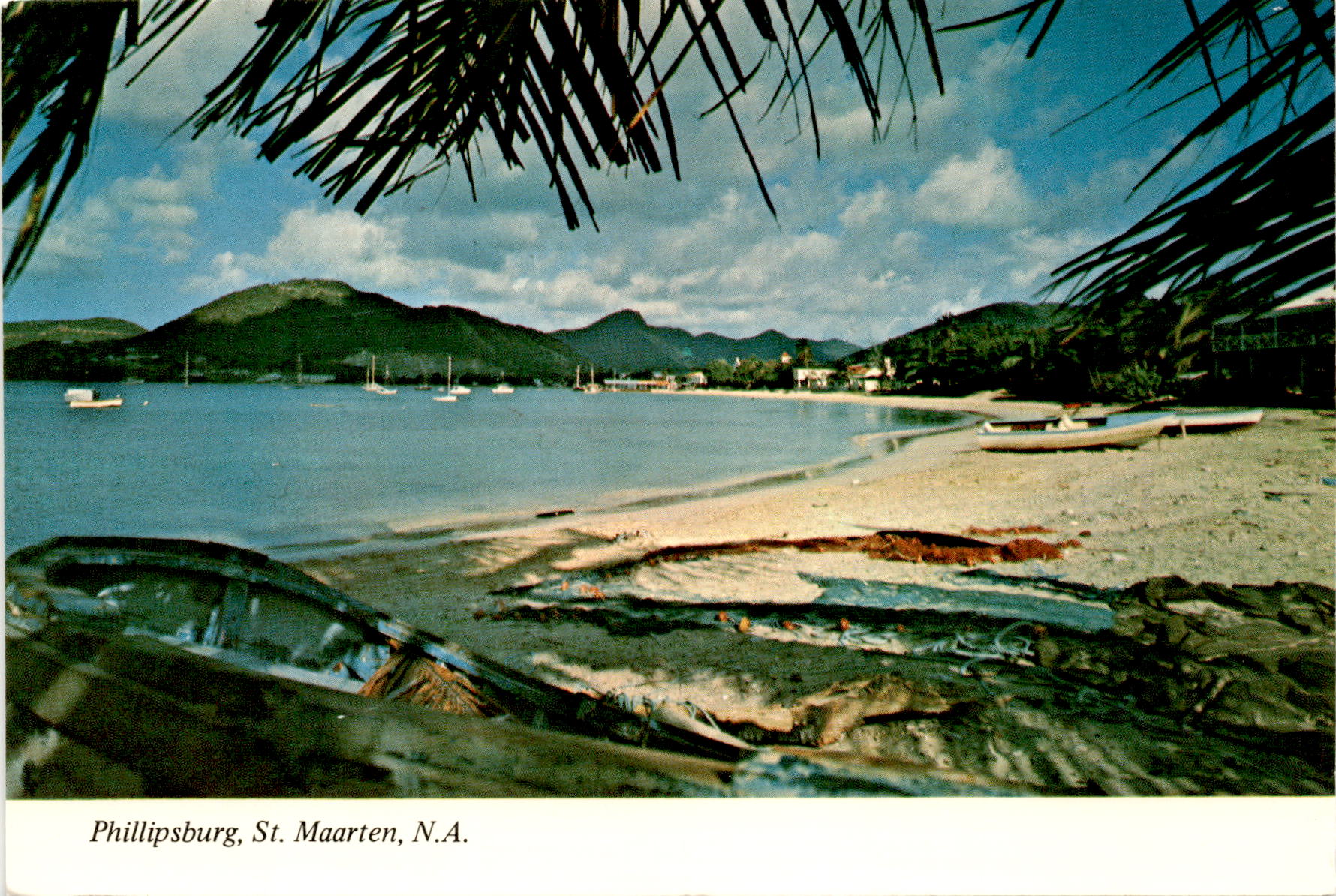 The postcard is promoting Phillipsburg, a town located in St. Maarten, a Caribbean island that is part of the Kingdom of the Netherlands. Phillipsburg is described as a quaint Dutch West Indian town where traditional practices are still observed. St. Maarten is highlighted as a unique and serene tropical resort island in the Caribbean.