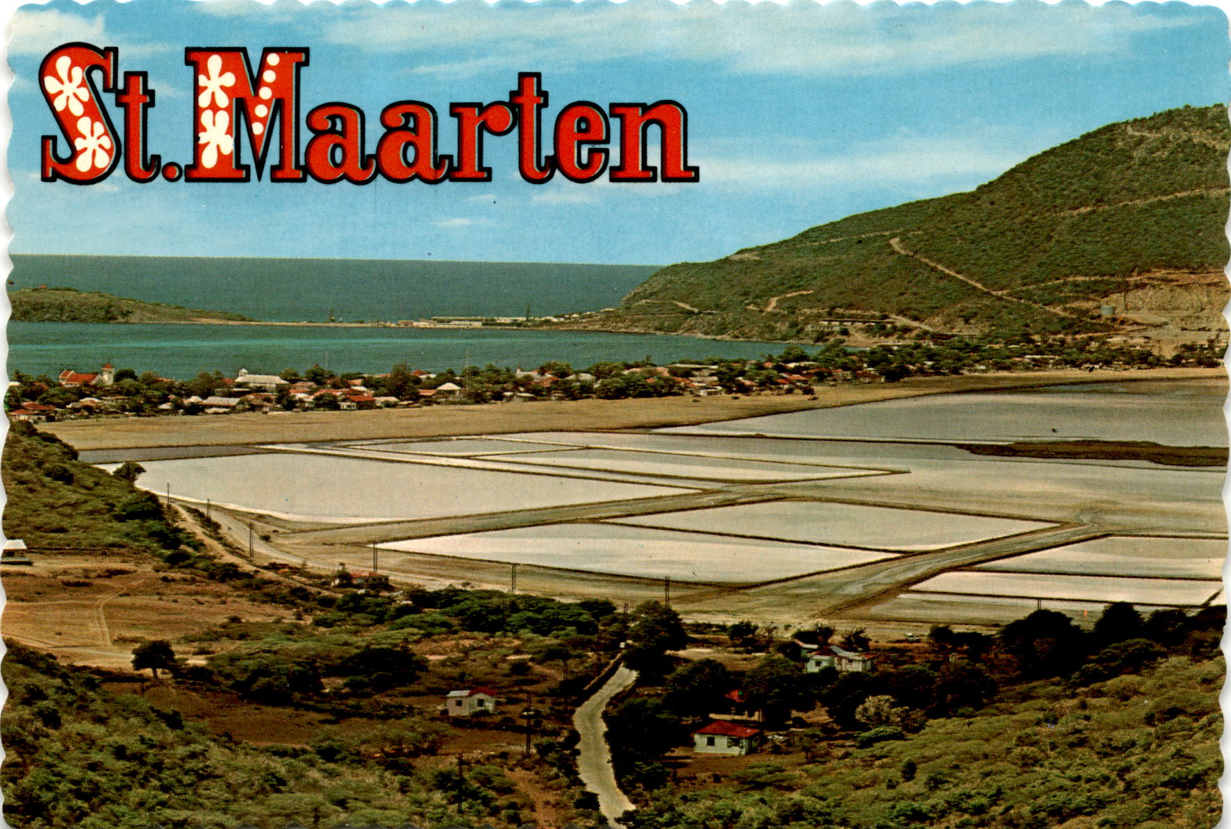 The postcard features an image of the salt-pans (ponds) of St. Maarten, highlighting their historical significance as the main industry and export of the island in former times. The image is in color by Larry Witt, and the postcard was produced in 1968 by Dexter Press in West Nyack, New York.St.