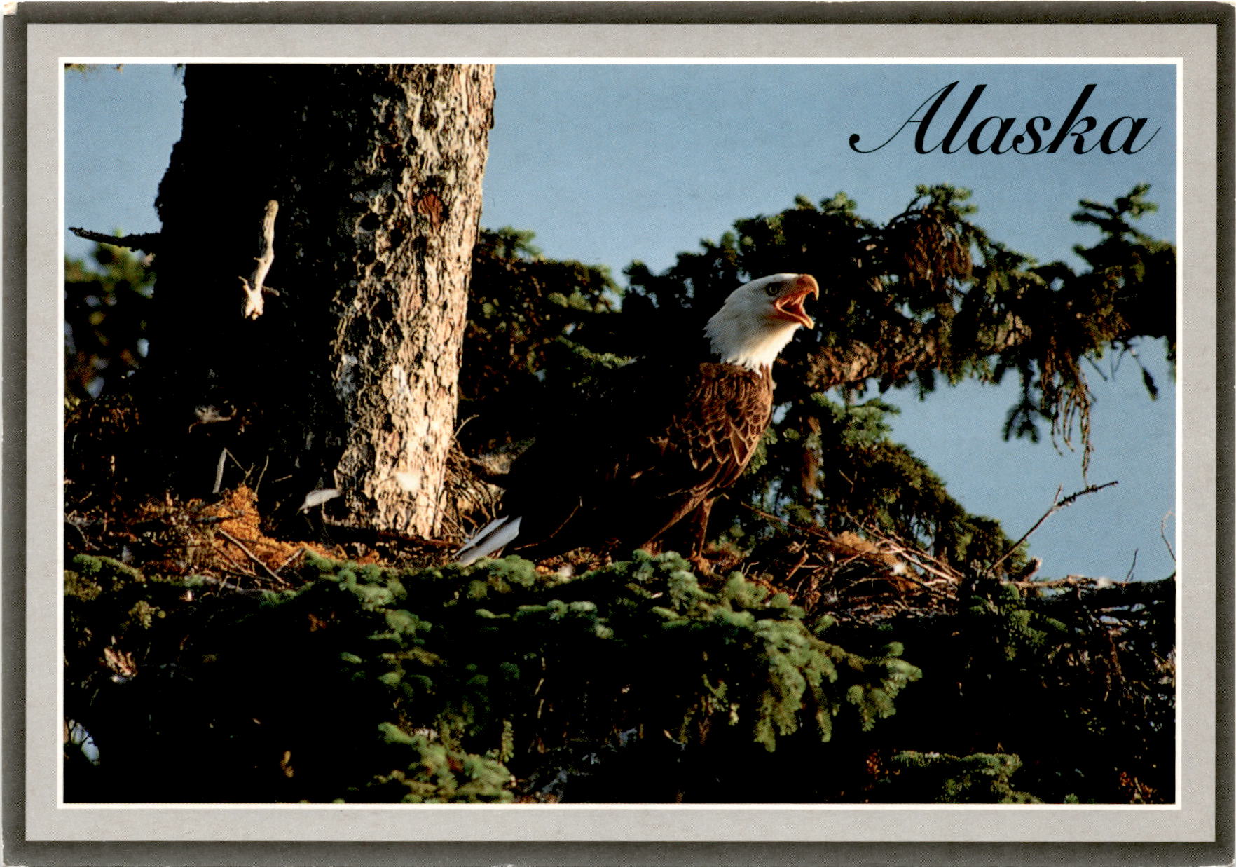 The postcard features a color photo of a Bald Eagle and its eaglet in a nest, taken in Alaska. The Bald Eagle has been protected by law in the United States since 1940. Alaska is known for being a habitat for Bald Eagles, where they can be found throughout the state.