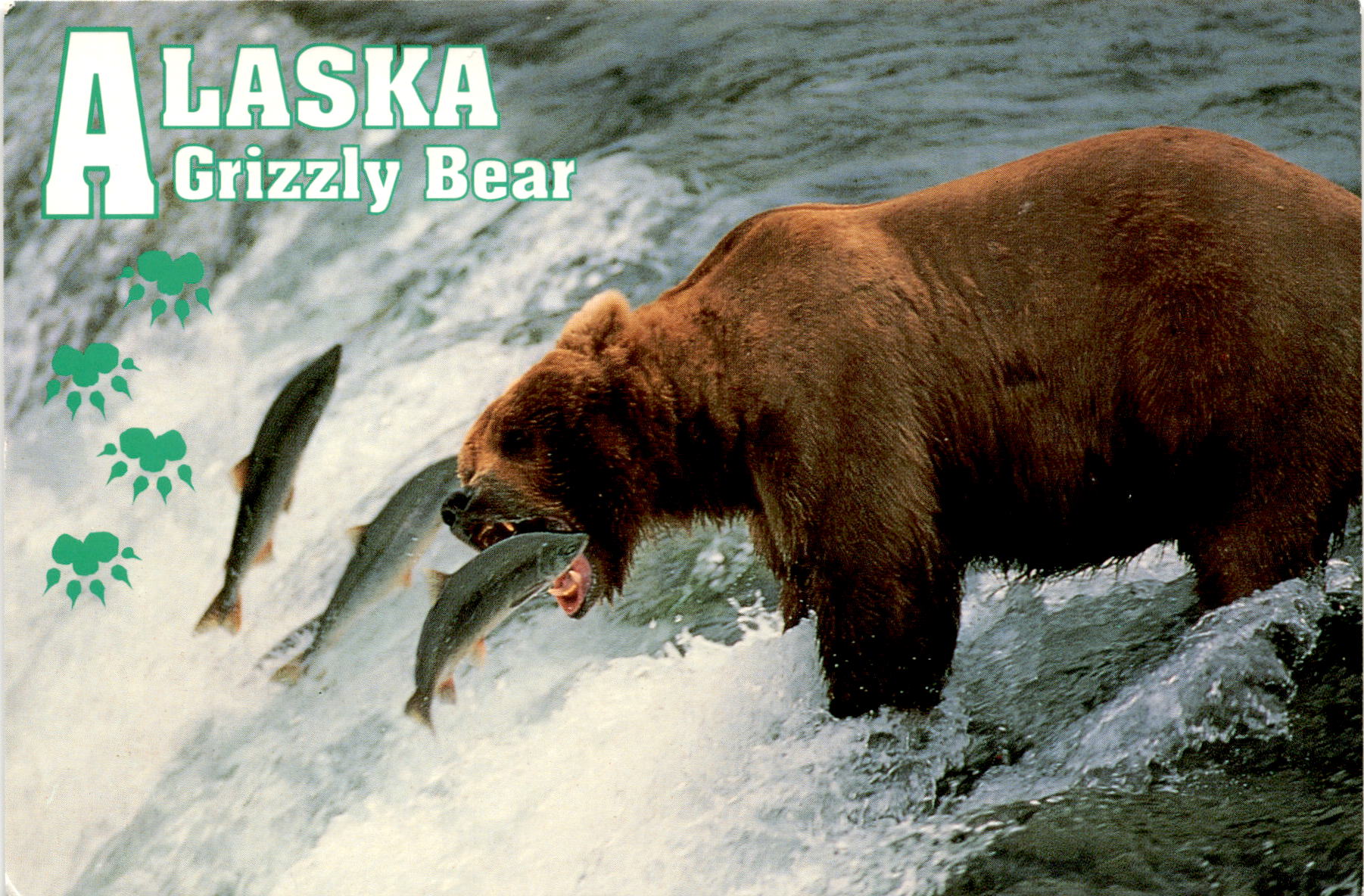 The postcard features an image of a Grizzly Bear fishing in Alaska, taken by Mike Roberts. The postcard was published by I.A.A.C., Inc. in Seattle, Washington. The image captures the wildlife and natural beauty of Alaska, particularly showcasing the iconic Grizzly Bear in its natural habitat.