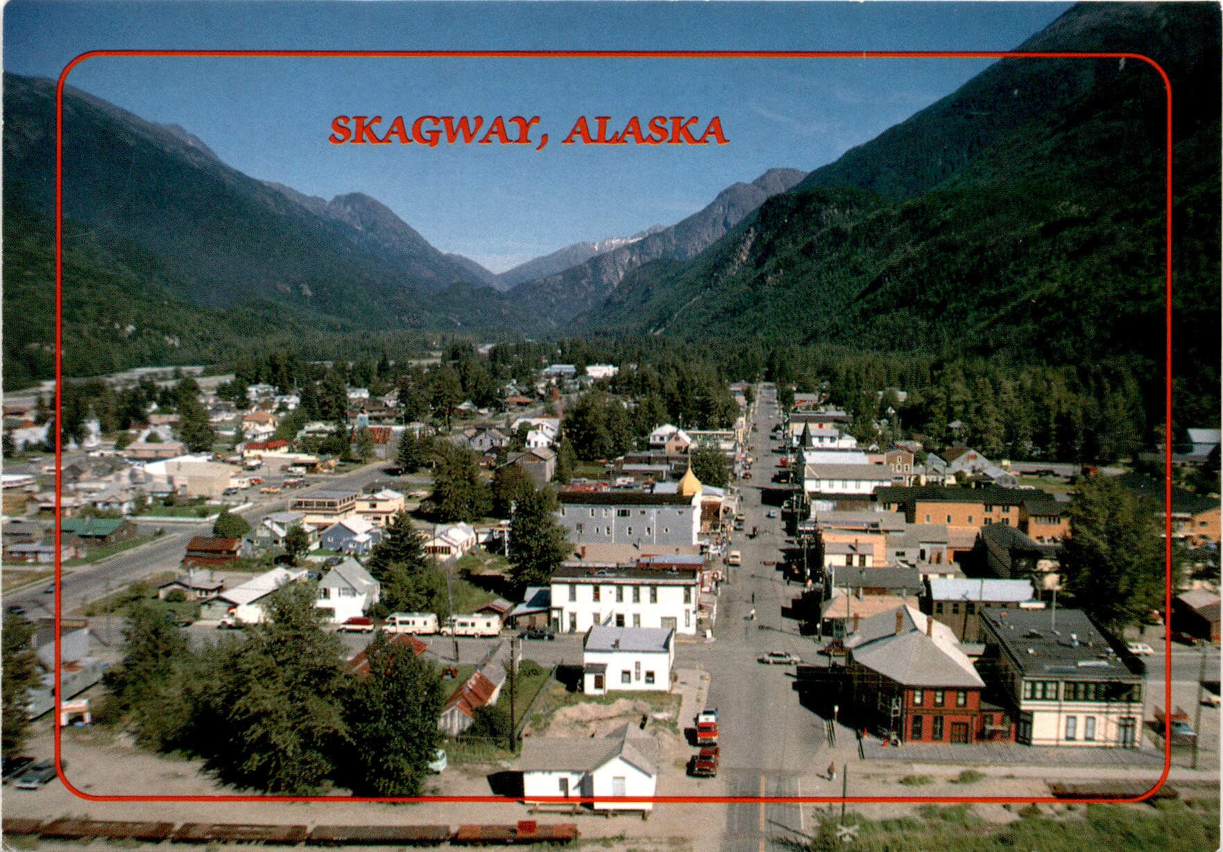 The postcard features an aerial view of Skagway, Alaska, showcasing boardwalks and old buildings along Broadway in the business district. Skagway was a crucial gateway to the Klondike during the gold rush era.